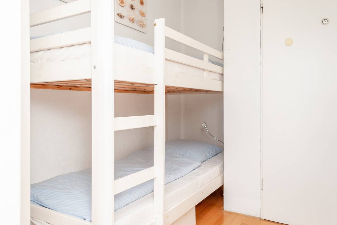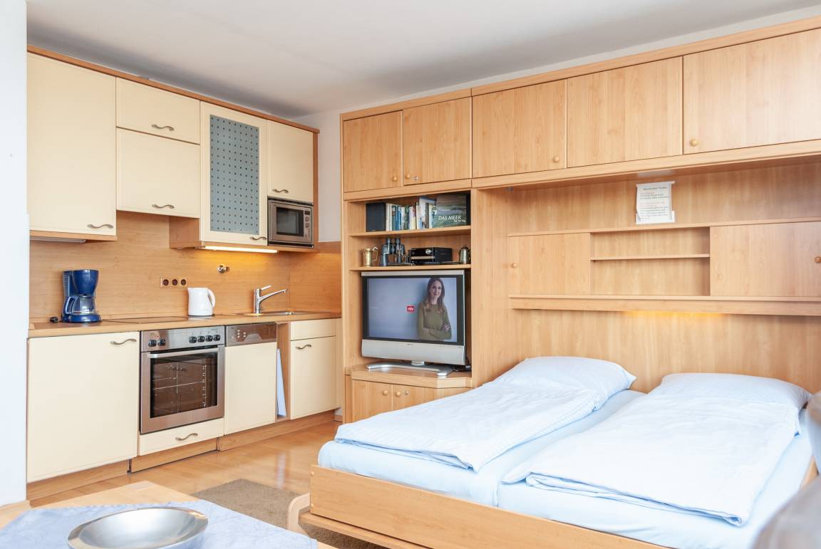 Das Apartment besteht aus einem Wohnbereich mit Schrankbett für 2 Personen, aus einem zusätzlichem Etagenbett in einer Nische im Flur und einem Badezimmer mit Dusche sowie WC. Die Ferienwohnung beinhaltet eine voll ausgestattete offene Küche.