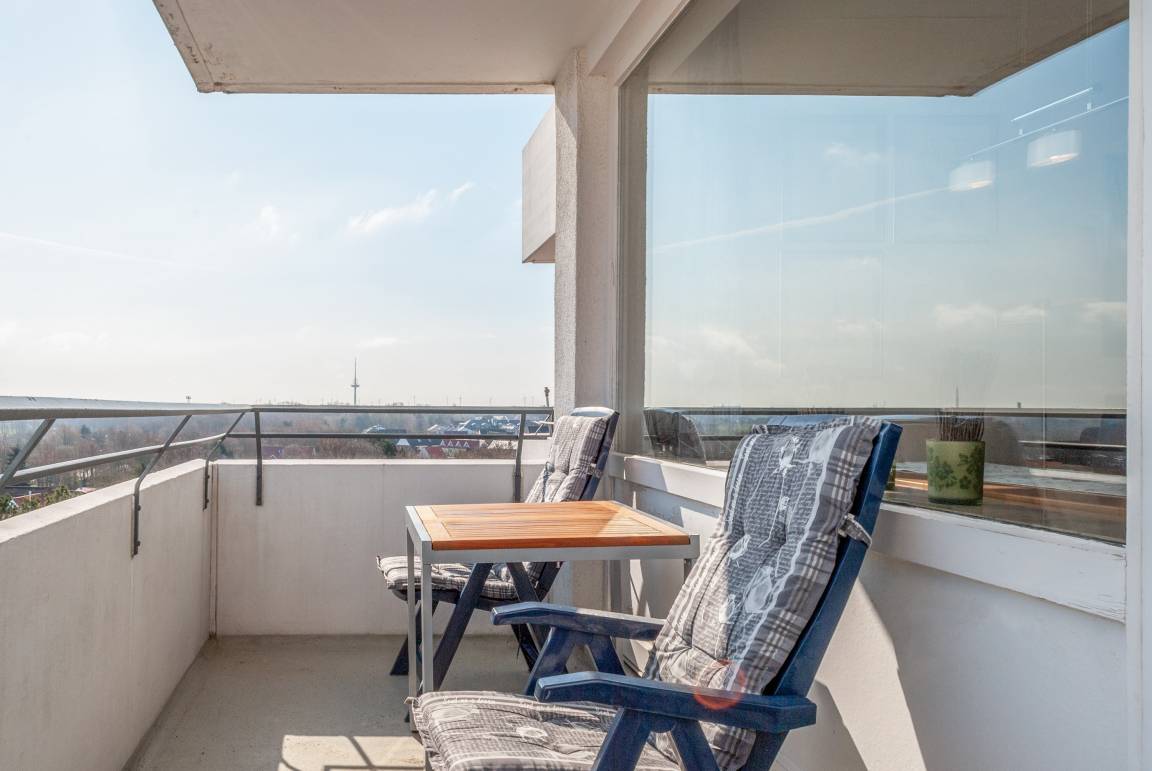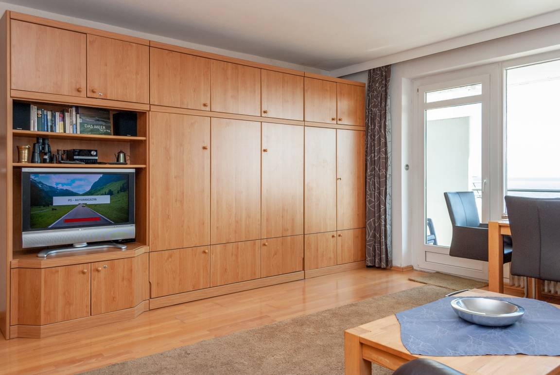 Das Apartment 710 ist ein 1-Raum-Apartment im 7. Obergeschoss für bis zu 4 Personen mit 40 qm. Der Ostbalkon mit Meerblick bietet Ihnen vormittags Sonne und nachmittags Schatten.