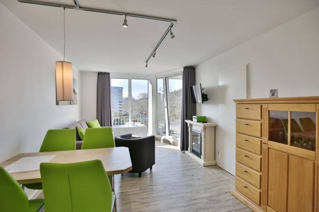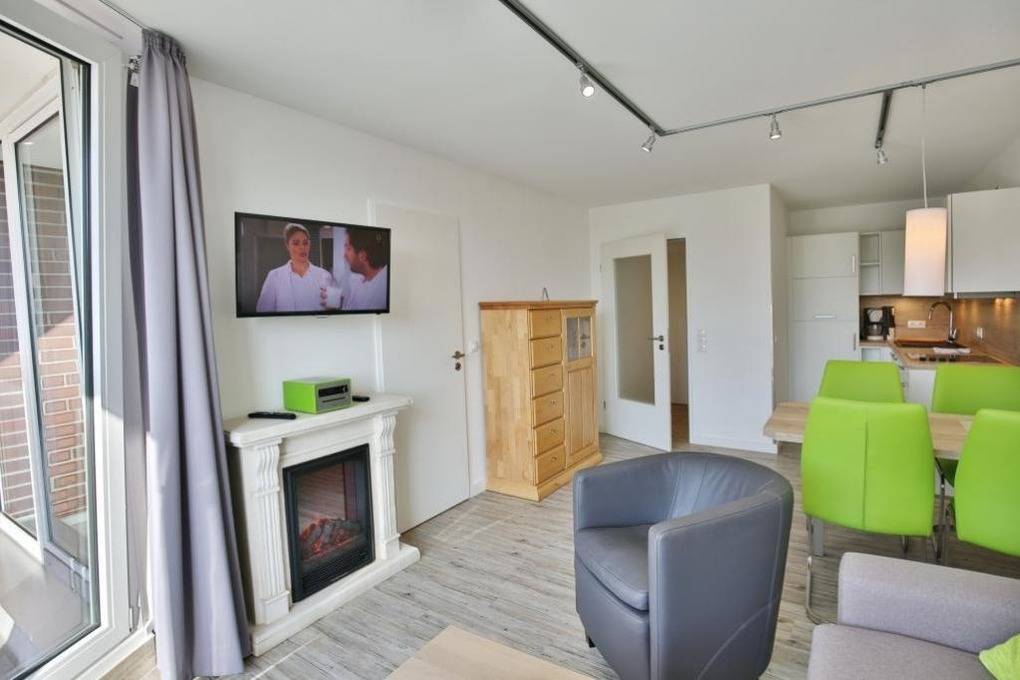 Schöne 2-Zimmer-Ferienwohnung über ca. 40m², 3. Etage mit Personenaufzug, vollständig ausgestattet bis max. 3 Pers., 1 Schlafzimmer mit 2 Einzelbetten, 1 kombiniertes Wohn/Schlafzimmer mit hochwertigem Schlafsofa, Elektrokamin, Sat-TV, kostenloses W-Lan, Radio mit CD, moderne Küchenzeile mit Geschirrspüler u. Mikrowelle, neues Du/WC, Föhn, großzügiger Sonnenbalkon zur Westseite (mit Balkonmöbeln [&] Sonnenschirm, saisonabhängig), extragroßer Pkw-Stellplatz in der Tiefgarage, keine Haustiere und natürlich Nichtraucher.
