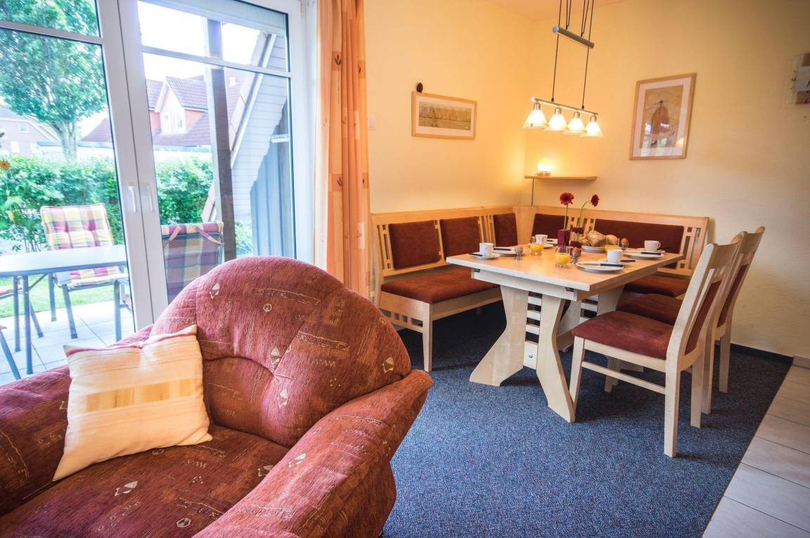 Die gemütliche Ferienwohnung im Erdgeschoss bietet auf 60 m² Platz für bis zu 5 Personen. Sie verfügt über zwei einladende Schlafzimmer, die für erholsame Nächte sorgen. Die offene Küche ist modern ausgestattet und umfasst einen 4-Platten-Herd, Backofen, Mikrowelle, Kühlschrank mit Gefrierfach sowie eine Kaffeemaschine, einen Toaster und einen Wasserkocher. Im angrenzenden Wohnzimmer sorgt ein Schlafsofa für zusätzlichen Komfort. Das Badezimmer ist funktional gestaltet und rundet die praktische Ausstattung ab. Vor der Wohnung befindet sich eine überdachte Terrasse von 12 m², ausgestattet mit Gartenmöbeln und einem Grill. Genießen Sie Ihre Zeit in dieser optimal gelegenen Wohnung, nur ca. 800 Meter vom Sandstrand entfernt, ideal für eine entspannte Auszeit nahe der Nordsee.