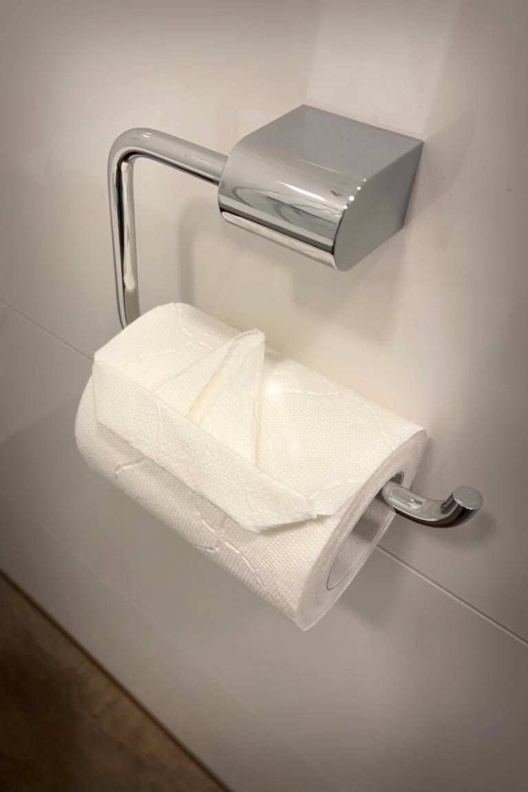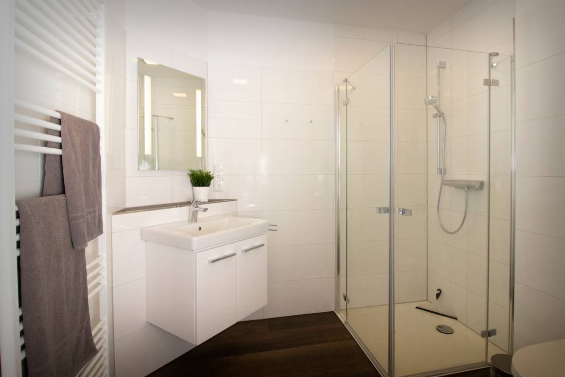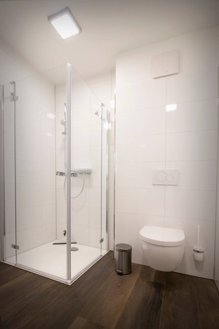 Das Bad ist mit WC, Waschtisch, Handtuchheizkörper und einer großzügigen, bodentiefen Glasdusche ausgestattet. Die praktische Raumaufteilung schafft viel Bewegungsfreiheit.