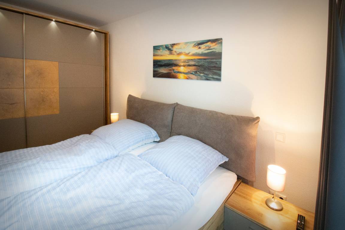 • Elternschlafzimmer mit komfortablem Doppelbett (offenes Fußende), TV, großem Kleiderschrank, Nachttischen mit Lampen und Verdunkelungsmöglichkeiten. Hochwertige Matratzen und Bettwäsche von Billerbeck sorgen für erholsamen Schlaf. Rückenstützkissen laden zum Lesen oder Fernsehen im Bett ein.