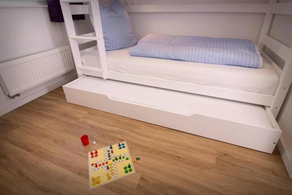 • Kinderzimmer mit Etagenbett (90x200 cm) und zusätzlicher Ausziehmatratze als Rausfallschutz. Auch hier gibt es Verdunkelungsmöglichkeiten für ruhige Nächte.