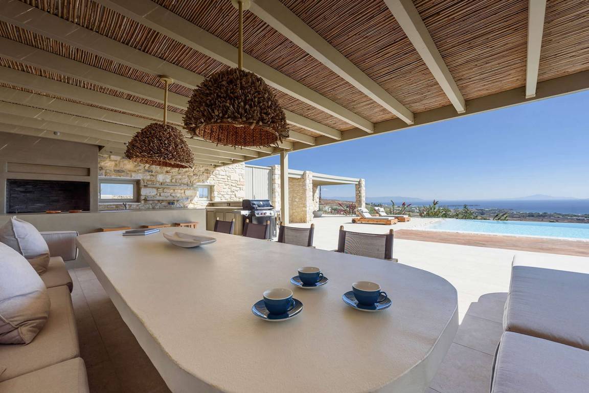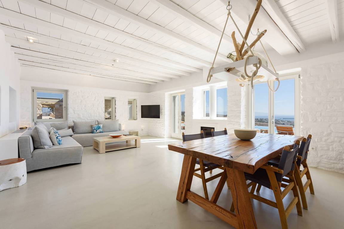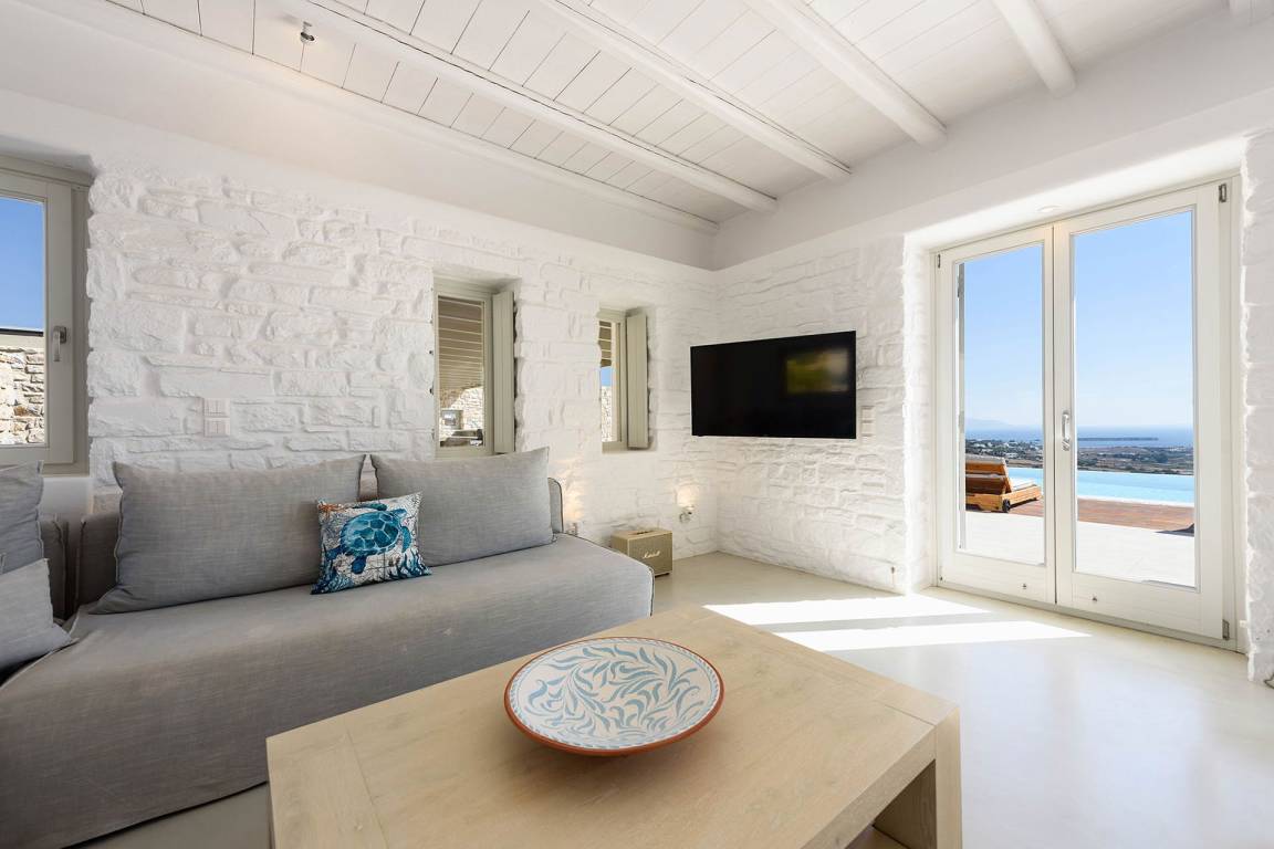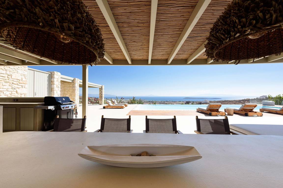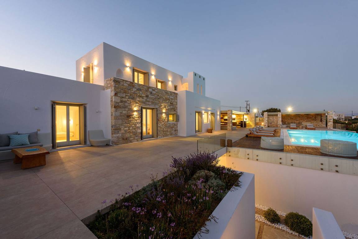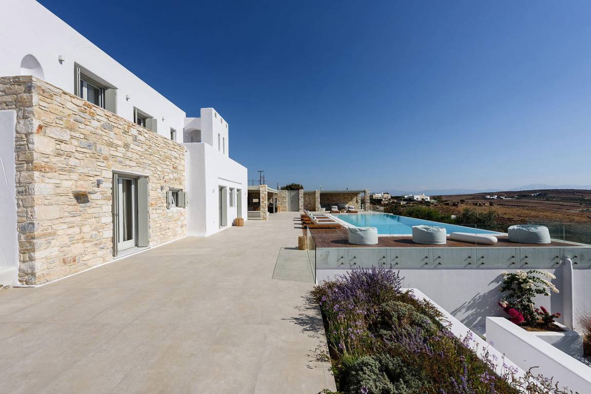 Die Villa liegt in Paros in unmittelbarer Nähe zum Golden Beach. Das Anwesen bietet Meerblick von innen.