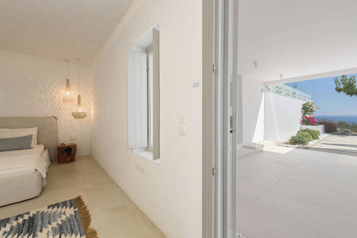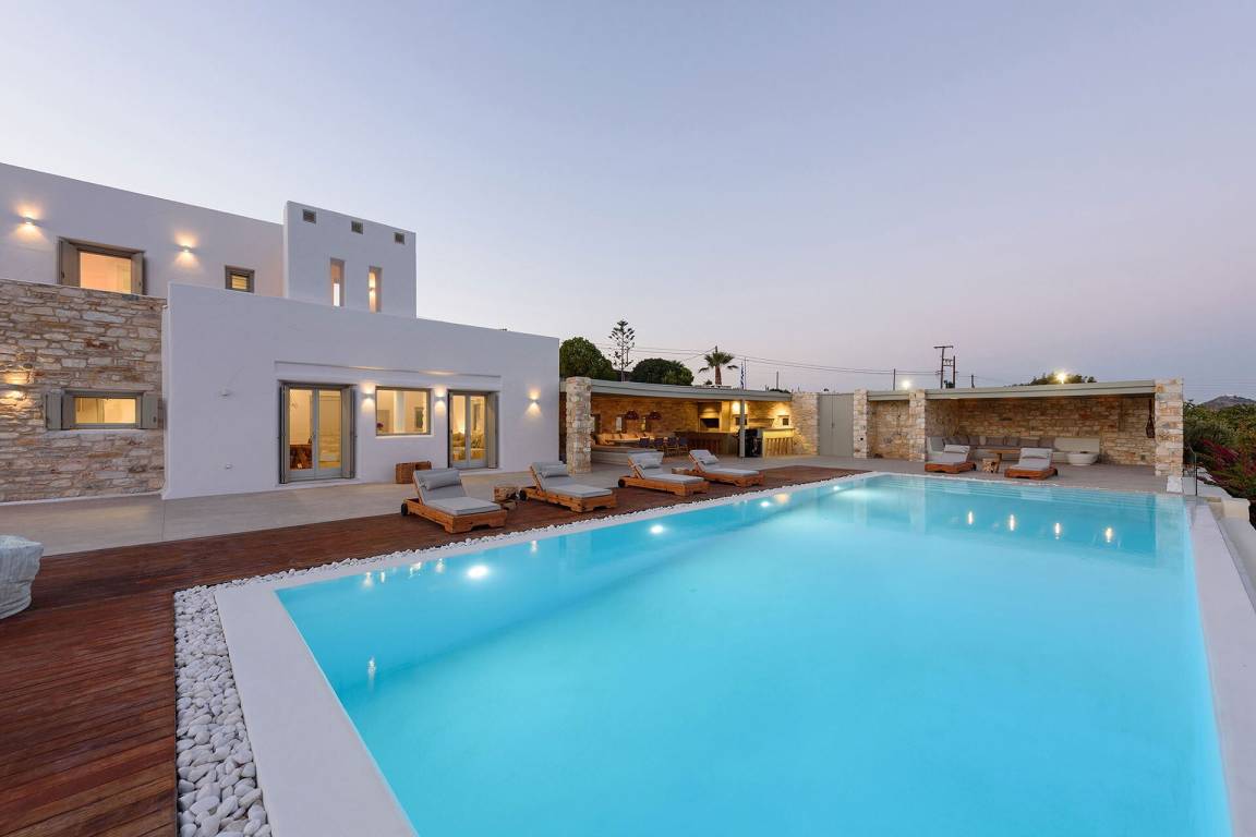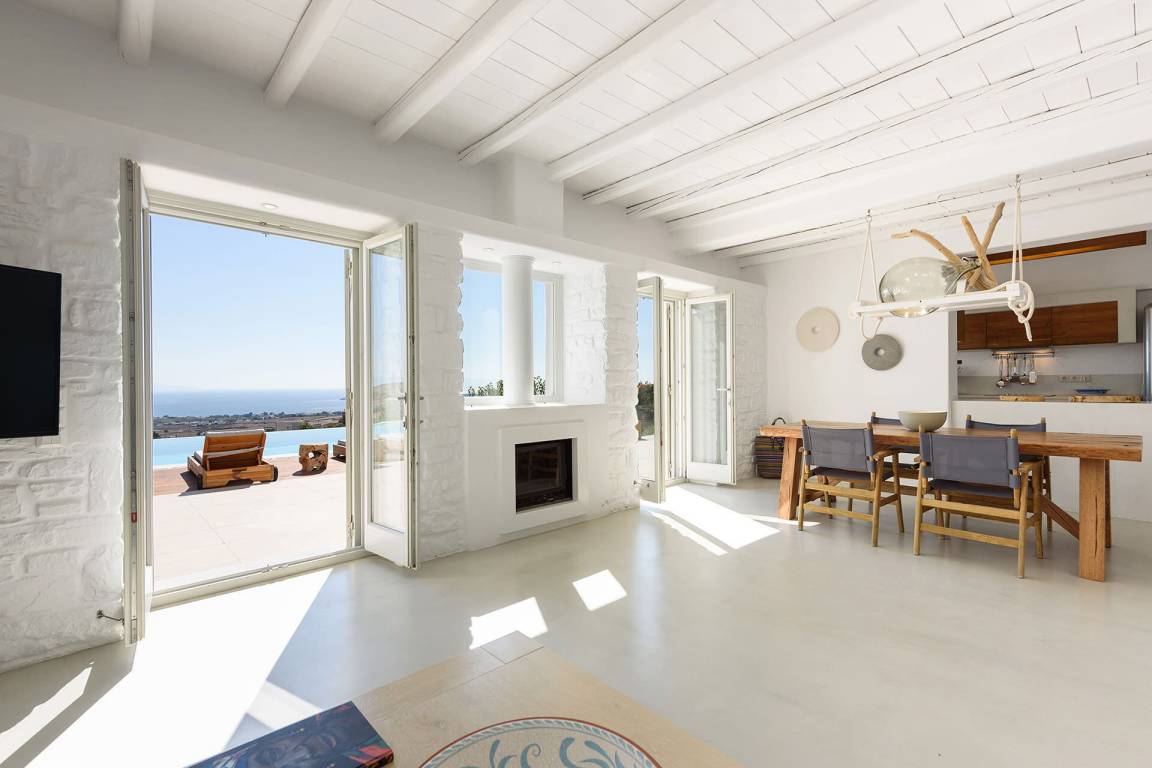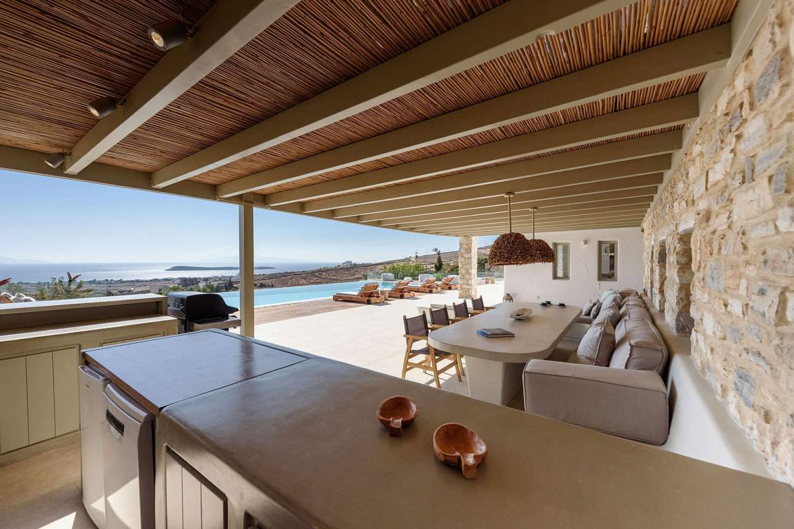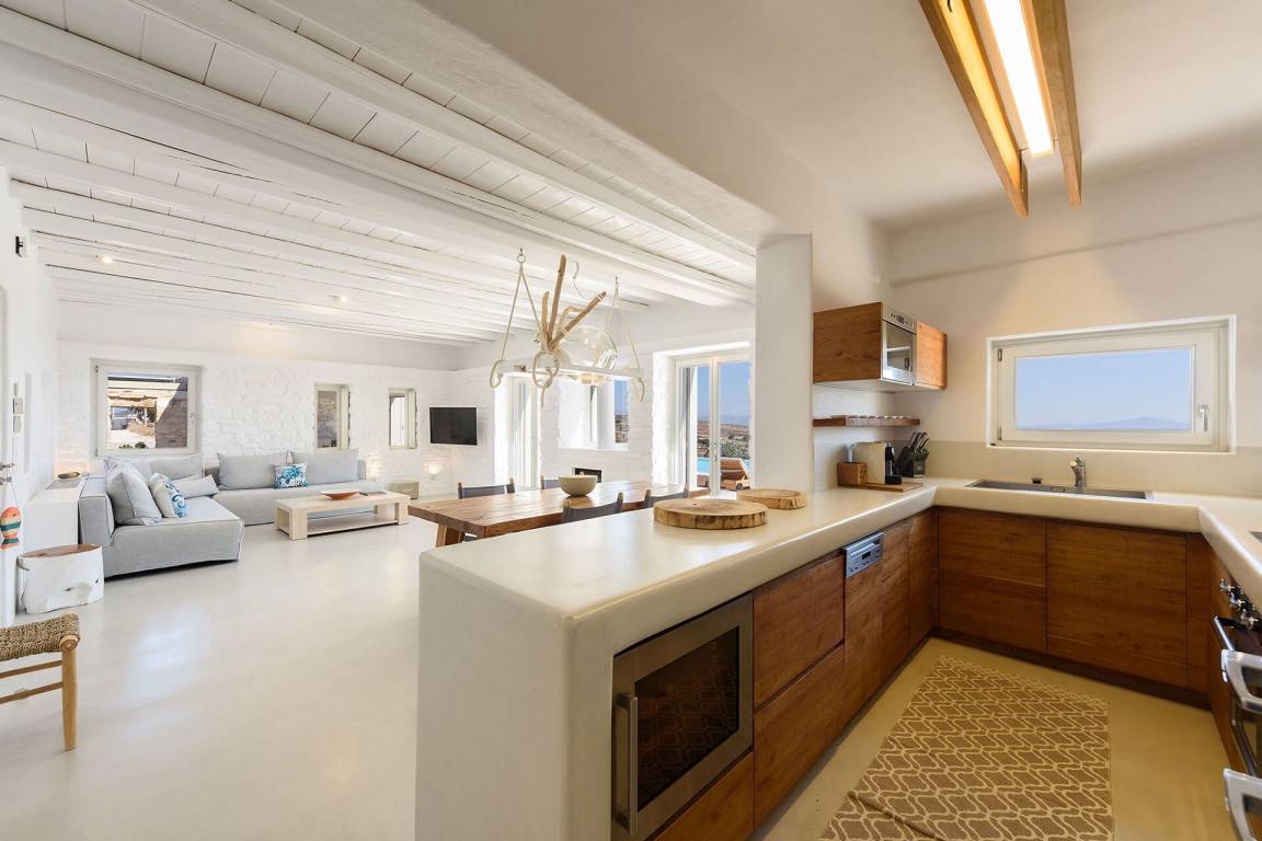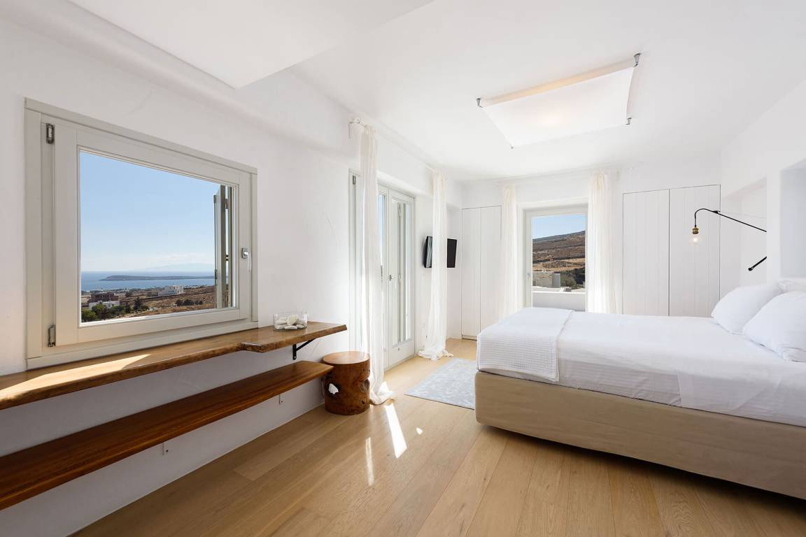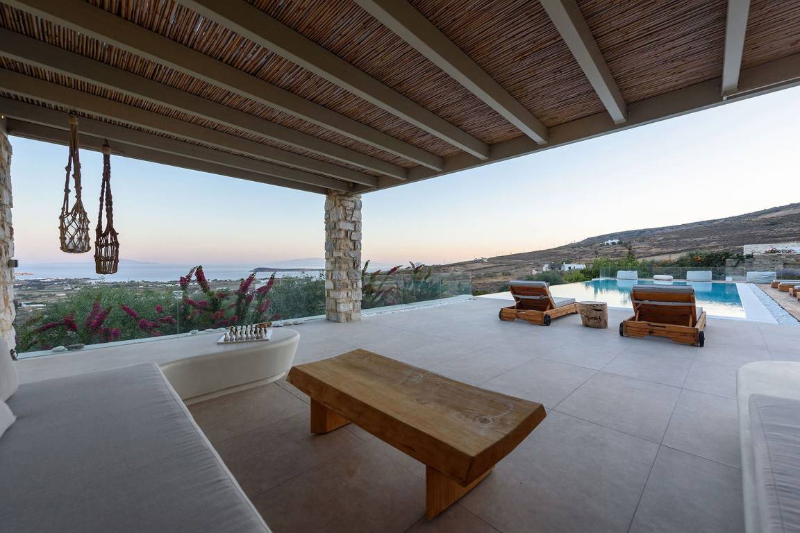 Die Villa liegt in Paros in unmittelbarer Nähe zum Golden Beach. Das Anwesen bietet Meerblick von innen.