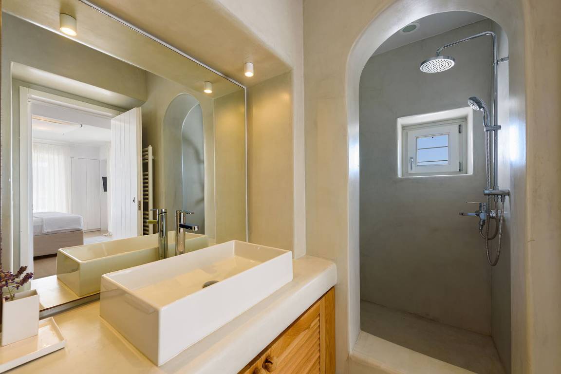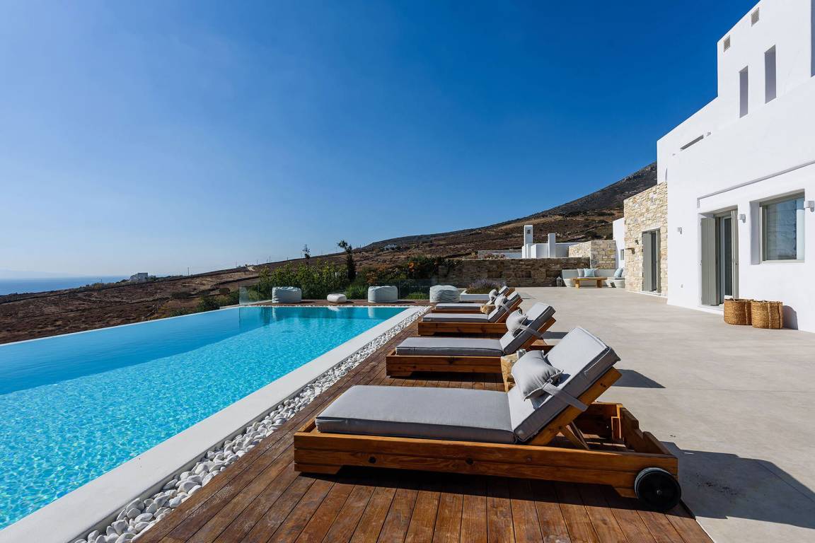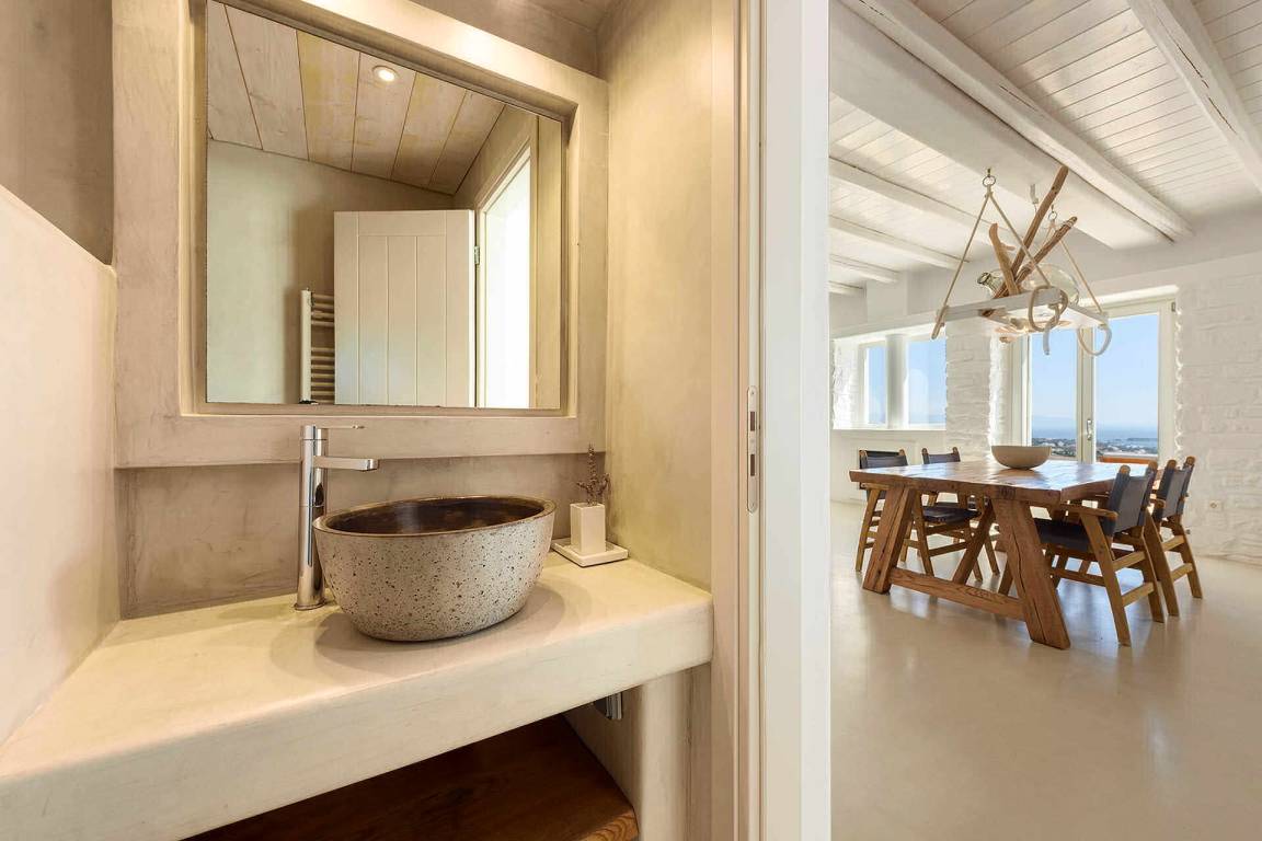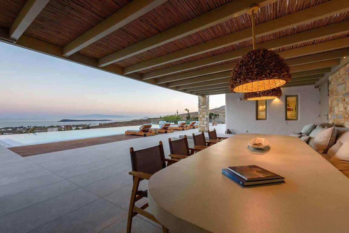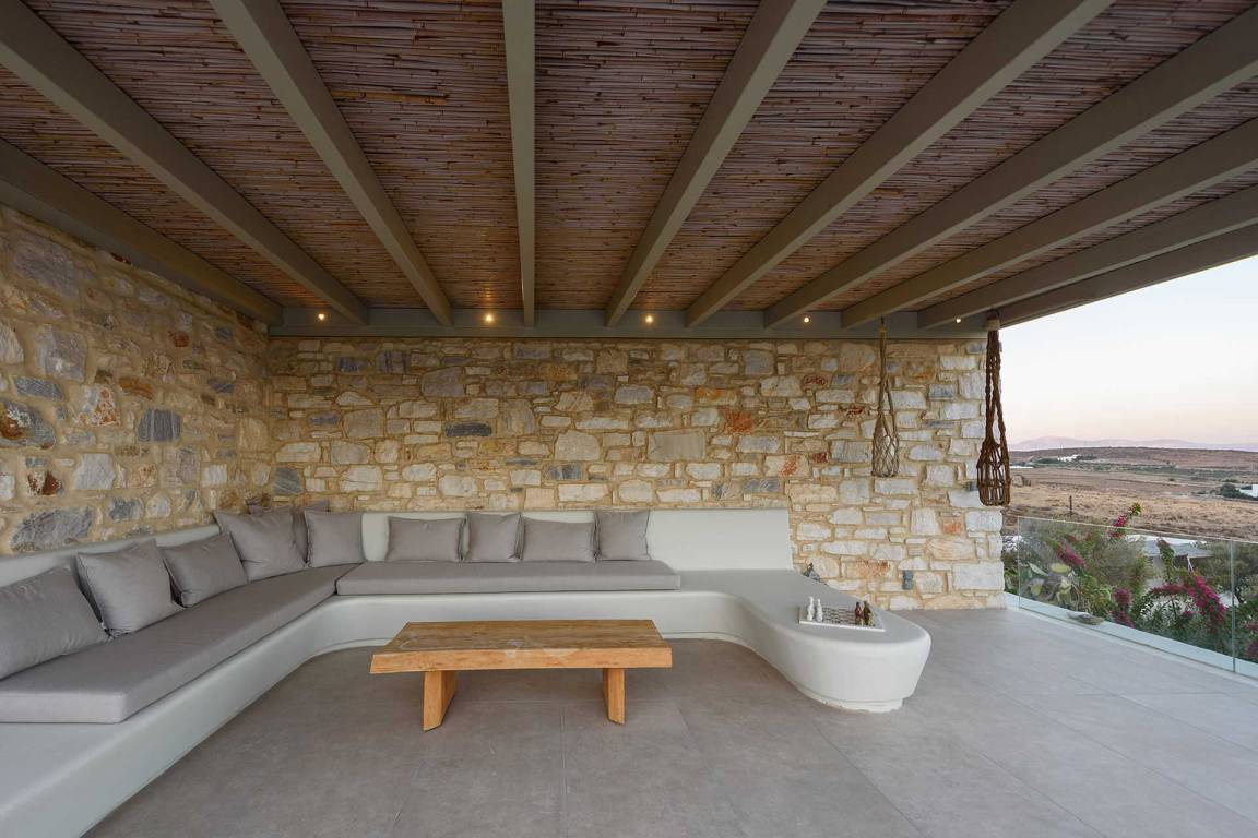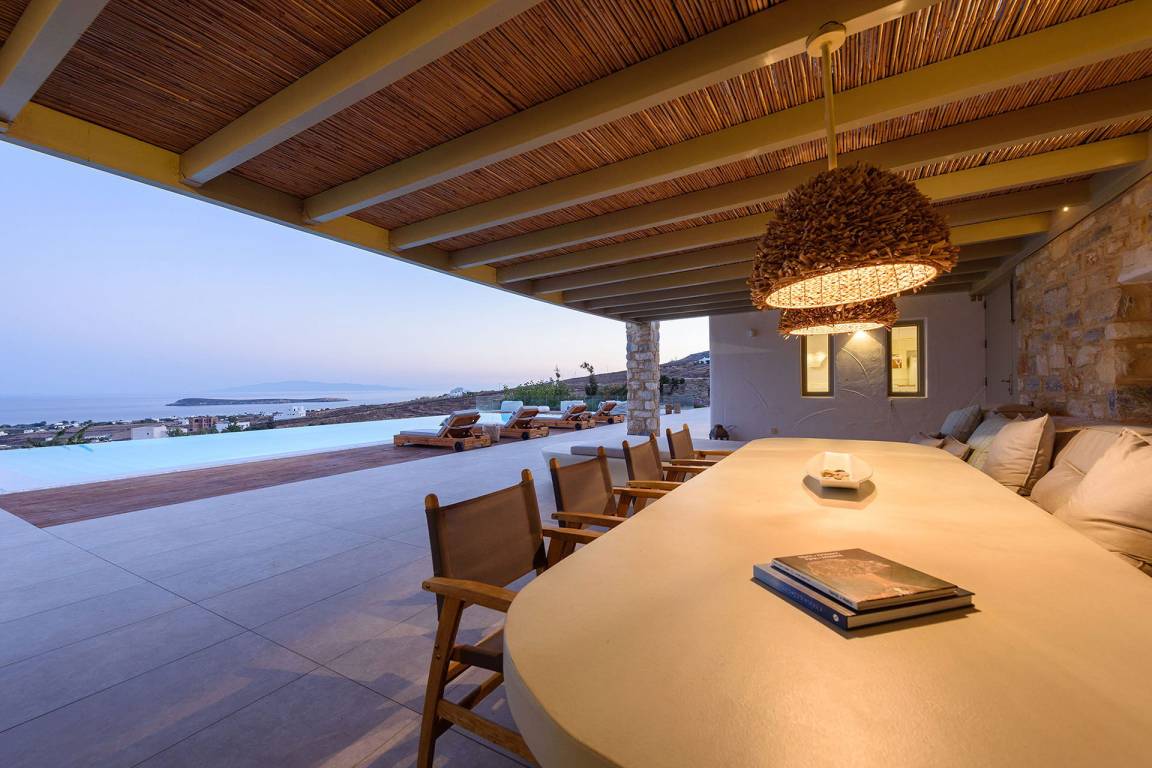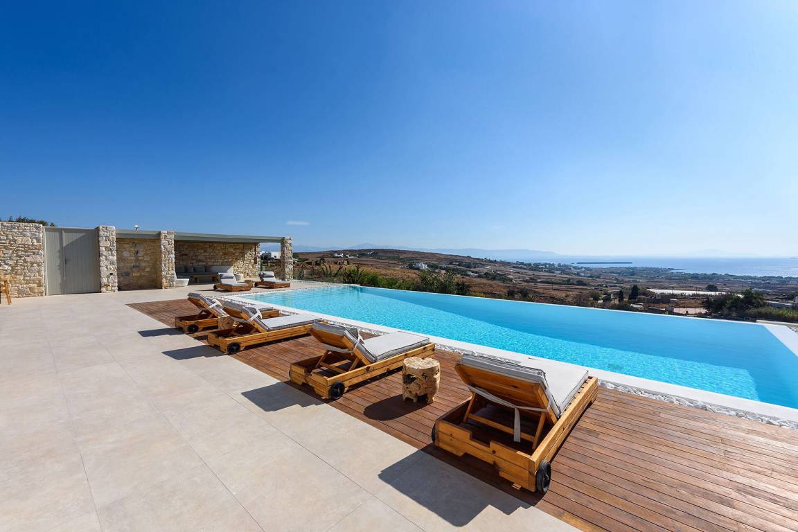 Die Villa liegt in Paros in unmittelbarer Nähe zum Golden Beach. Das Anwesen bietet Meerblick von innen.