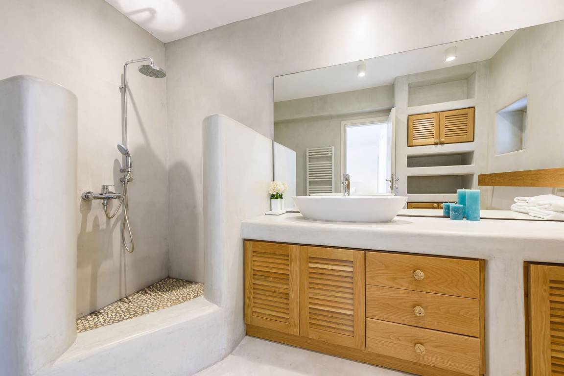 Die Villa verfügt über eine Gesamtfläche von etwa 200 Quadratmetern, verteilt auf mehrere Ebenen, und bietet Platz für bis zu 8 Gäste. Die Unterkunft umfasst 4 Schlafzimmer und 4 Bäder. Die Wohnbereiche sind großzügig und offen gestaltet und verbinden sich fließend mit den Außenbereichen, in denen sich der private Swimmingpool und das Meer befinden.