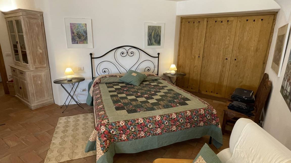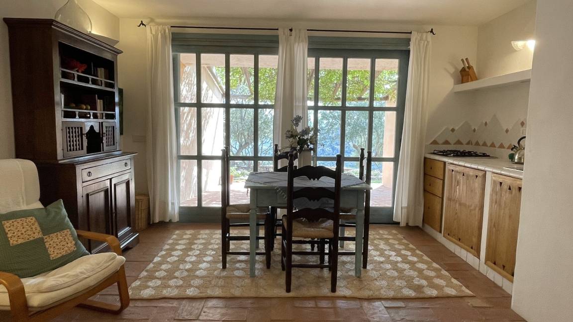 Über eine Steintreppe, innerhalb des Hauses, gelangt man von der Hauptetage zum Apartment der Gartenetage. Hier befindet sich auch der Hauswirtschaftsraum mit Waschmaschine, Trockner und Bügelbrett etc. Das geräumige Apartment verfügt über Küche, Ess- und Schlafbereich mit eigenem Bad. Das Apartment hat eine teilweise überdachte Terrasse und einen eigenen Ausgang zum Garten und Pool.