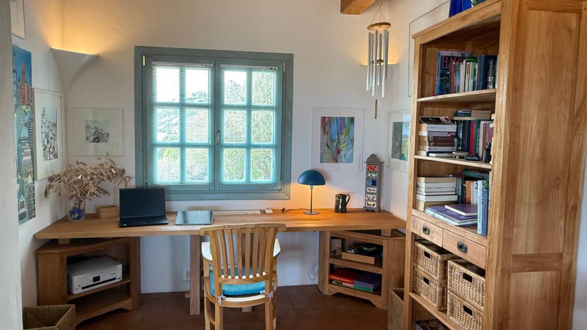 Ein integriertes Homeoffice, mit kostenlosem schnellem Internet, ermöglicht wichtige Arbeiten. Vom offenen Wohnbereich mit Kamin hat man einen großartigen Blick weit über Land und Meer. Über dem Wohnbereich führt eine kleine Treppe zur Empore für den ungestörten Rückzug mit Couch und Lesesessel. Der Essbereich, in unmittelbarer Nähe zur geräumigen, offenen Küche, hat einen Zugang zu Terrasse und Pool. Im hinteren Teil befinden sich noch zwei Schlafzimmer und zwei Bäder. Wäschewechsel alle 14 Tage.