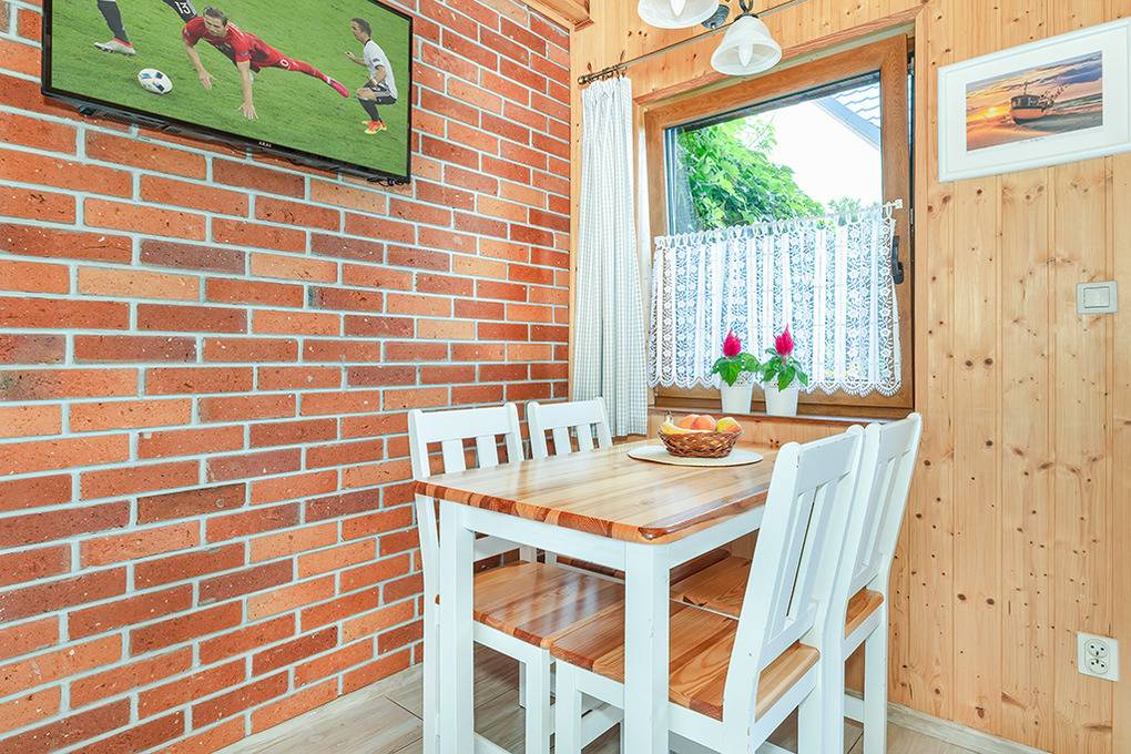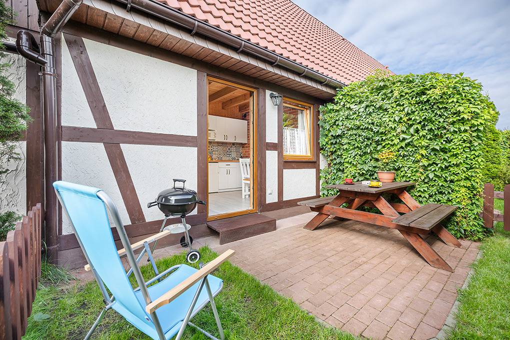 PL 66.10 Ferienhaus 2-6 Pers.: 2-Zimmer-Reihenhaus mit ca. 40 qm Wohnfläche über 2 Etagen. Parterre: Wohn-/Essraum mit Sofa (Ausziehcouch 2 Pers.), SAT-TV (6 dt. Programme), Internet (WLan), Esstisch, Küchenzeile (2 E-Platten Ceranfeld). Bad/WC. 1. Etage: 4-Bettzimmer mit Doppelbett, zwei Einzelbetten. Kleine Sitzecke im Garten.