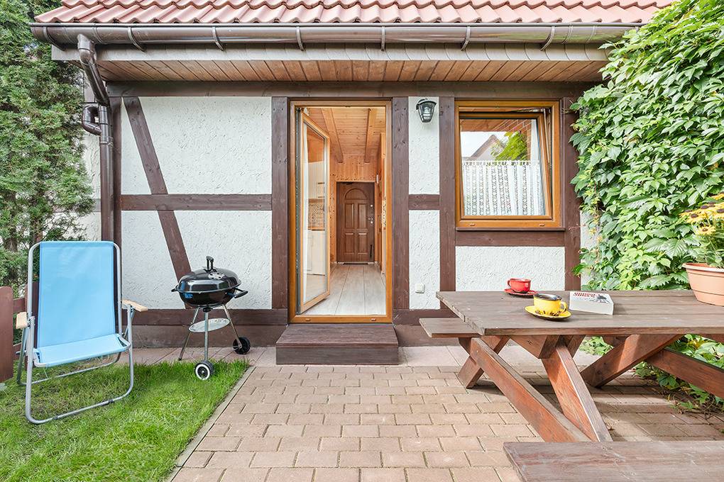 Haus: Schöne, kleine Ferienhaussiedlung mit 12 Fachwerk-Reihenhäusern auf einem gepflegten Rasengrundstück (825 qm). Geschmackvolle Einrichtung. Rustikal-gemütlicher Flair durch Holzbalkendecken. Kostenloses Internet (WLan). Heizung: teils Fußbodenheizung (4 Häuser), teils E-Radiatoren (8 Häuser), Warmwasser über E-Boiler (50 l). Kleine Sitzecke im Garten. Kinderspielplatz mit Rutsche, Schaukel, Sandkasten, Trampolin. 1 Parkplatz/FH.
