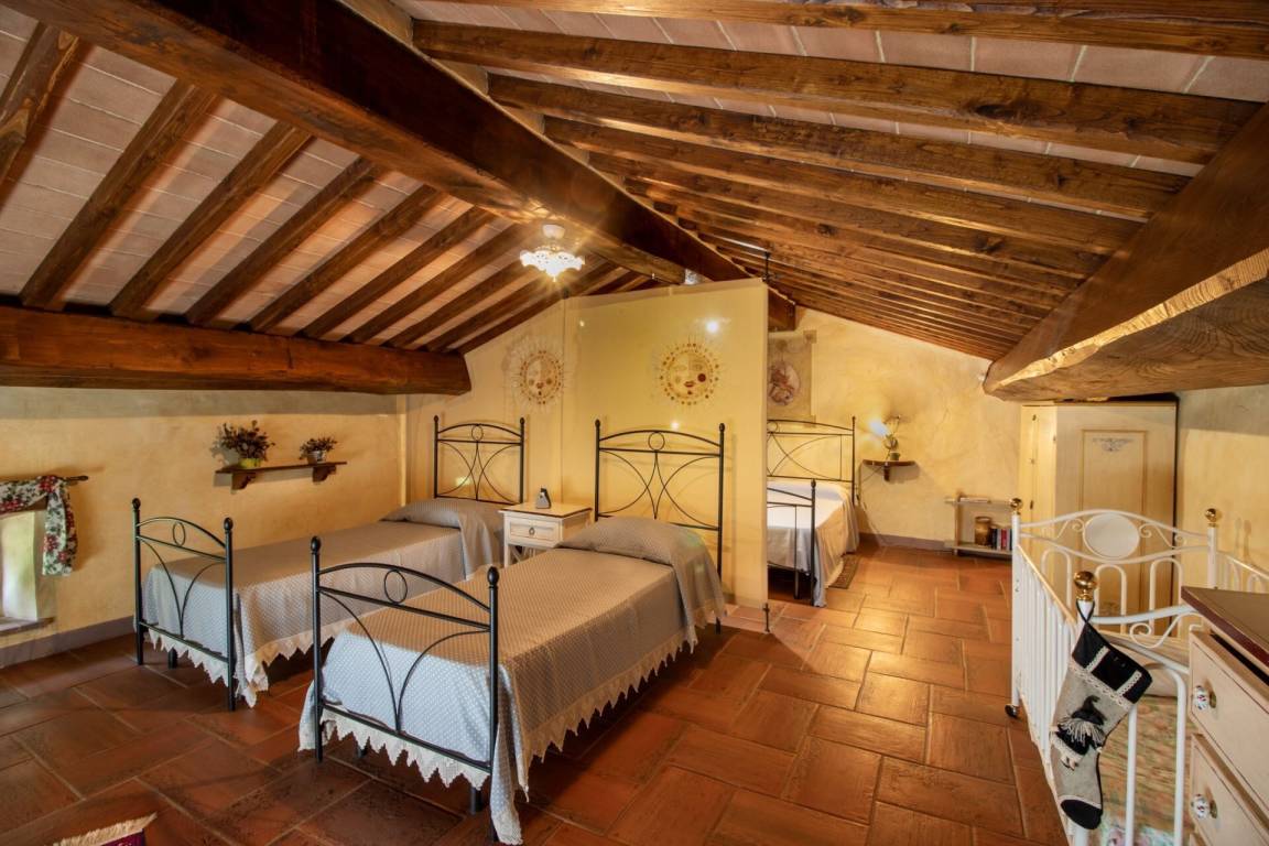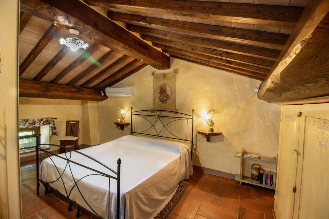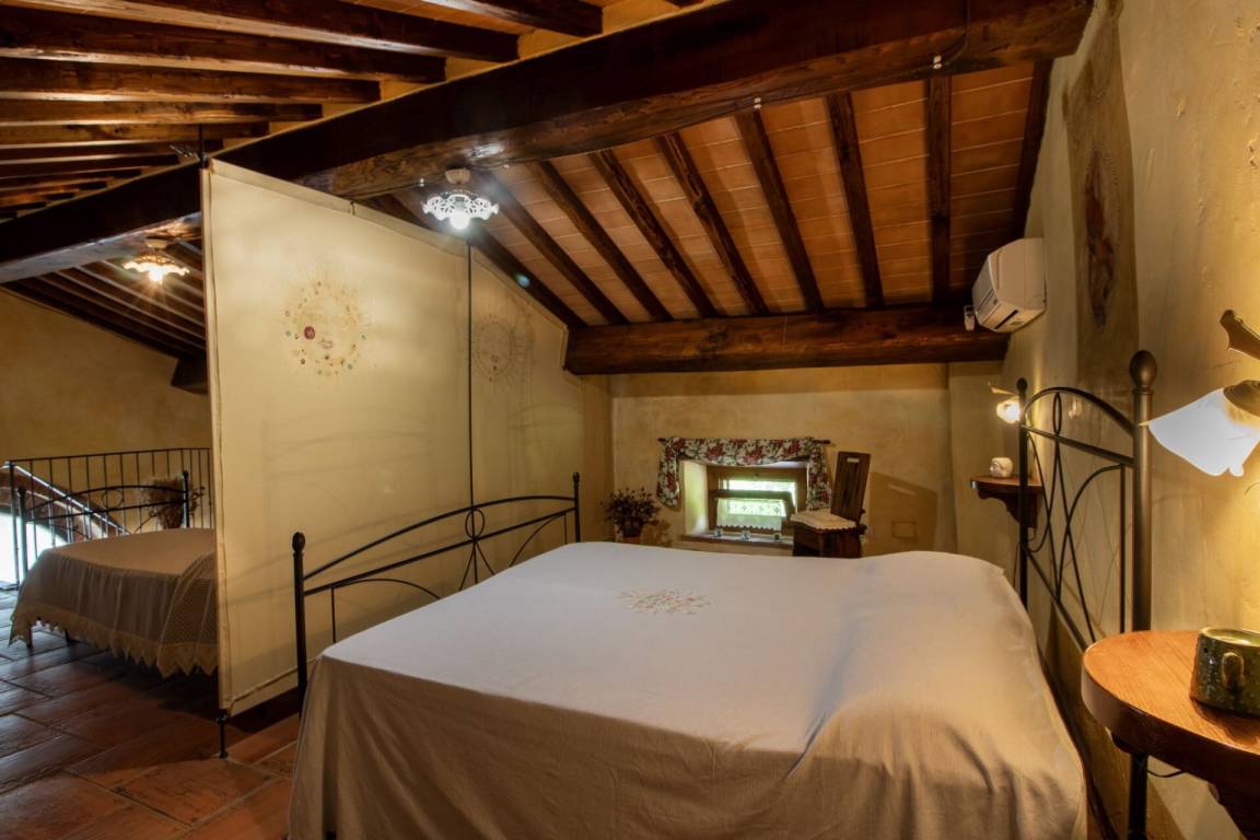 Über eine teils aus Naturstein bestehende teils schmiedeeiserne Treppe erreicht man im ersten Stock einen geräumigen offenen Raum mit Terra Cotta Fußboden und typischer Holzbalkendecke, der durch ein Séparée in einen Bereich mit Doppelbett und einen Bereich mit zwei Einzelbetten unterteilt ist. Pergola mit Gartenmöbeln zum Essen im Freien.