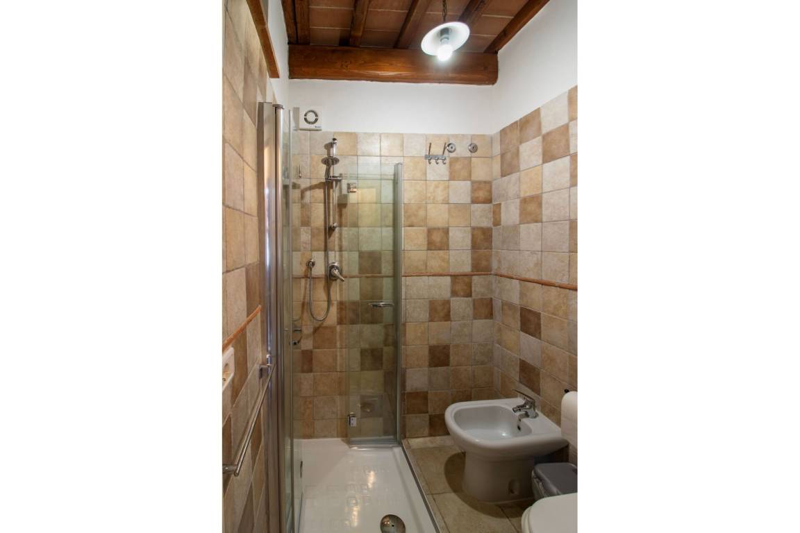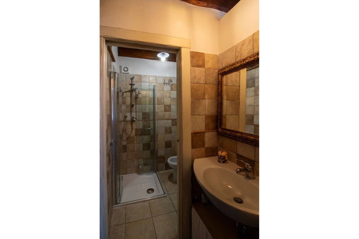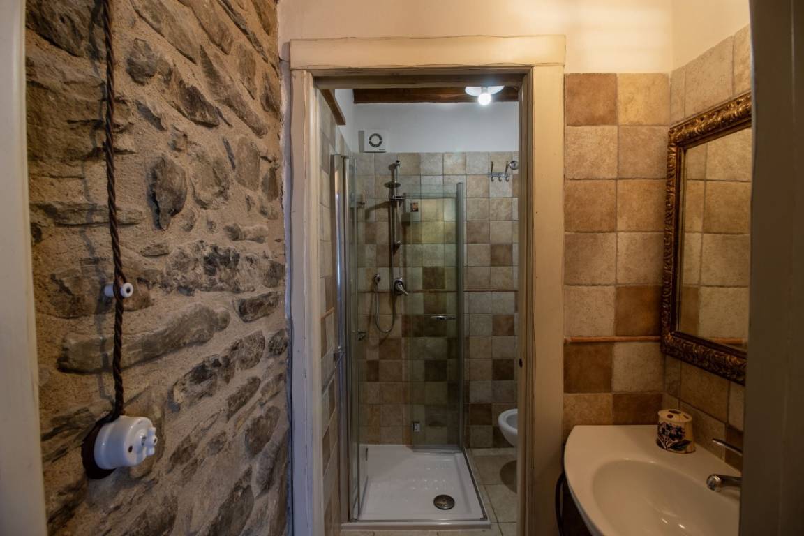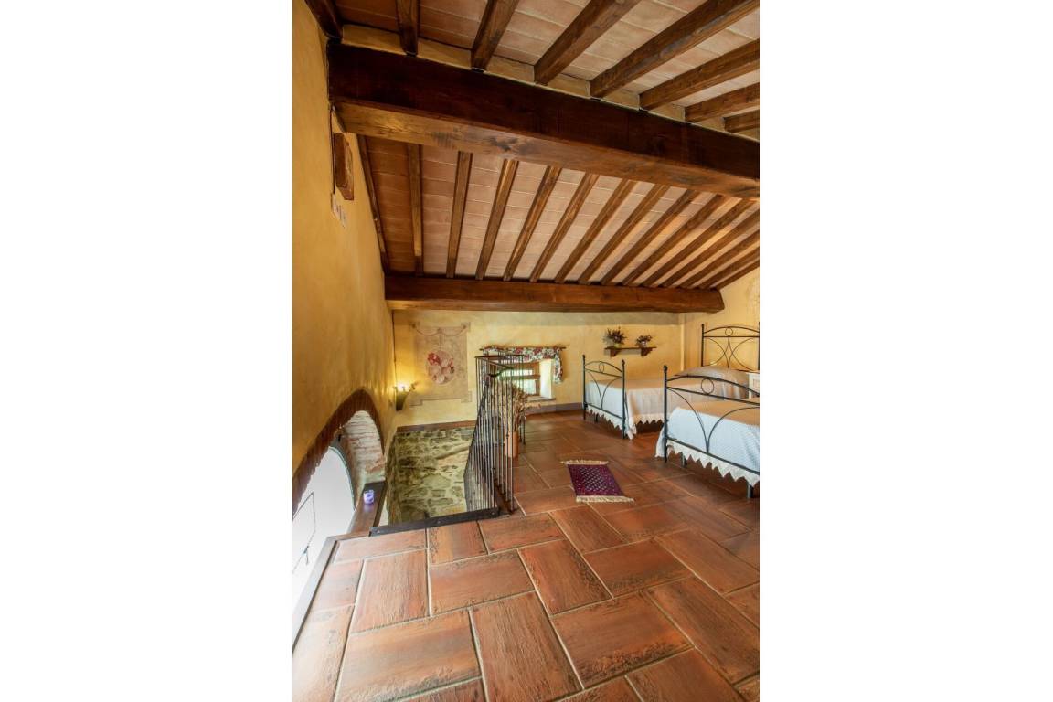 Über eine teils aus Naturstein bestehende teils schmiedeeiserne Treppe erreicht man im ersten Stock einen geräumigen offenen Raum mit Terra Cotta Fußboden und typischer Holzbalkendecke, der durch ein Séparée in einen Bereich mit Doppelbett und einen Bereich mit zwei Einzelbetten unterteilt ist. Pergola mit Gartenmöbeln zum Essen im Freien.