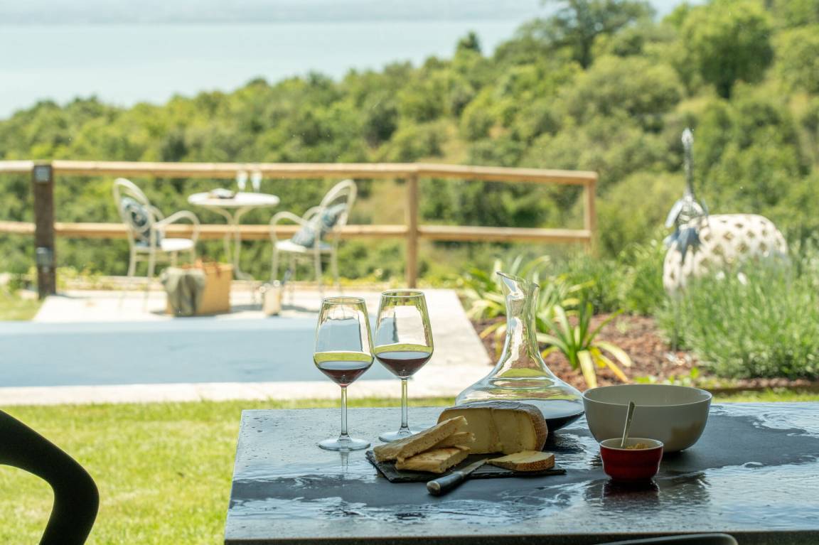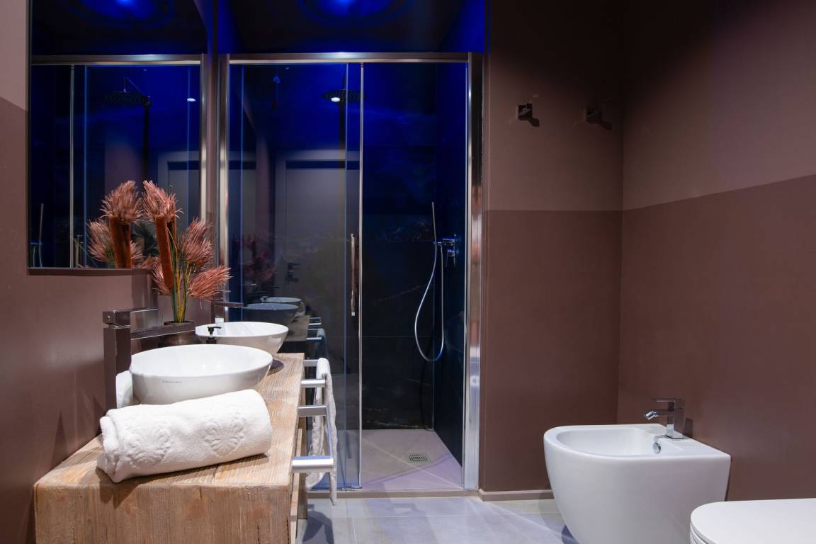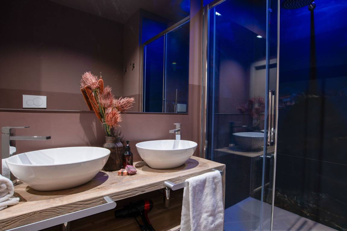 Schlafzimmer mit Bad 3: Doppelbett, WiFi Internet, Klimaanlage, Sessel, Schreibtisch, Waschbecken, WC, Bidet, Badewanne, Dusche, Fön, Ausgang auf den Garten.