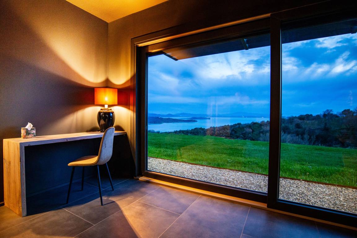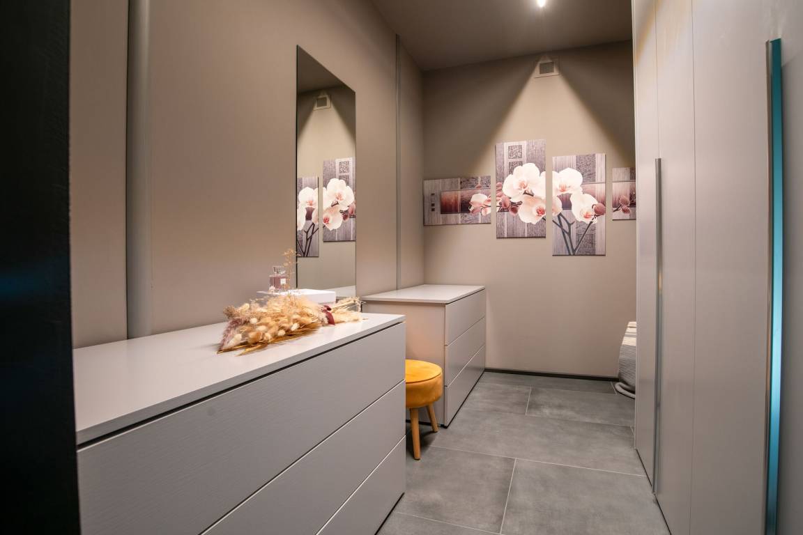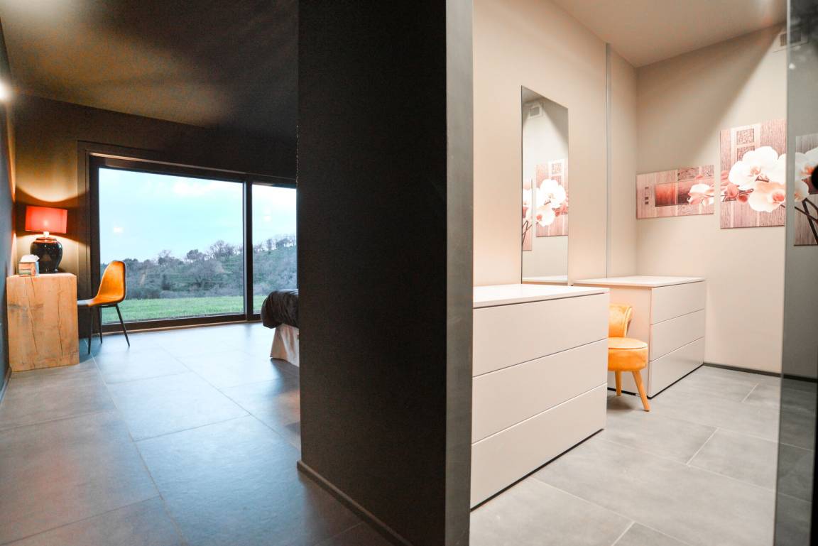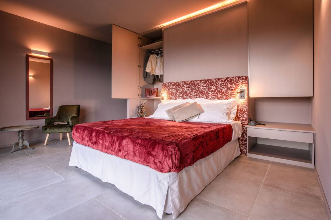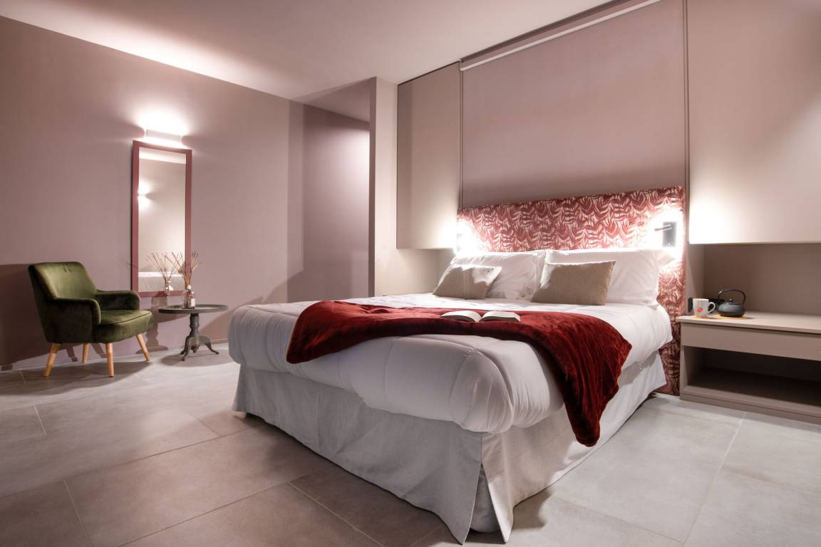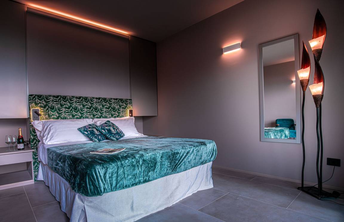 Schlafzimmer mit Bad 1: Doppelbett, WiFi Internet, Klimaanlage, Sessel, Schreibtisch, Waschbecken, WC, Bidet, Dusche, Fön, Trockner, Waschmaschine, Ausgang auf den Garten.