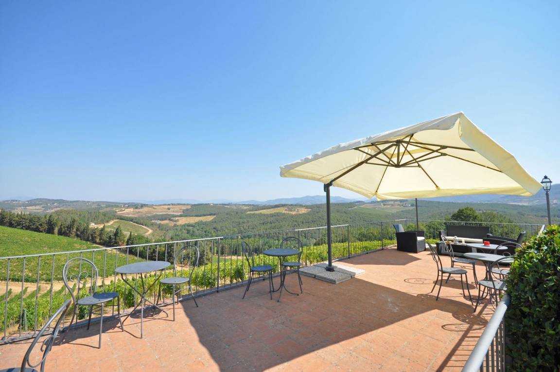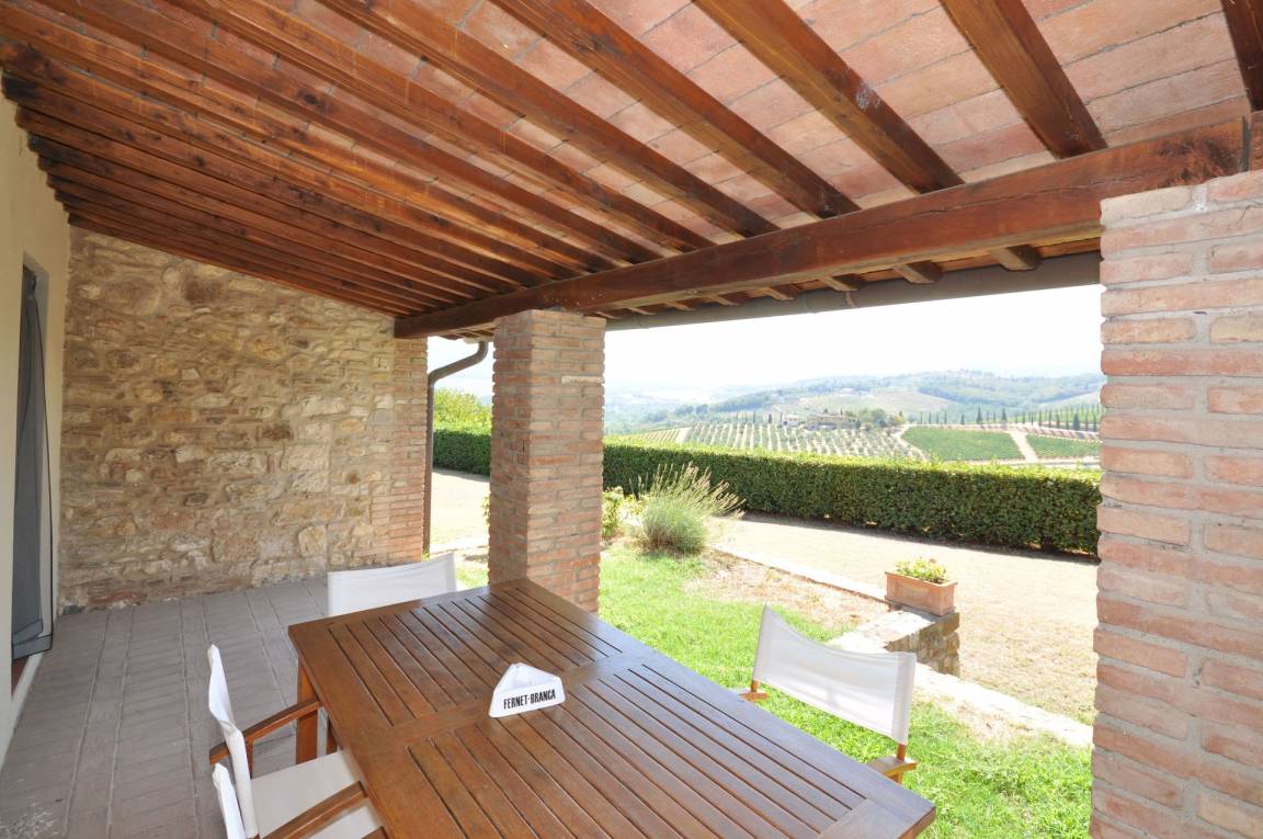 Erdgeschoss Eingang zum Essbereich mit Kochecke (Ofen und Tiefkühlfach), Zugang zu überdachter Loggia mit Tisch und Stühlen und Panoramablick, Zweibettizimmer mit Zugang auf die Loggia.