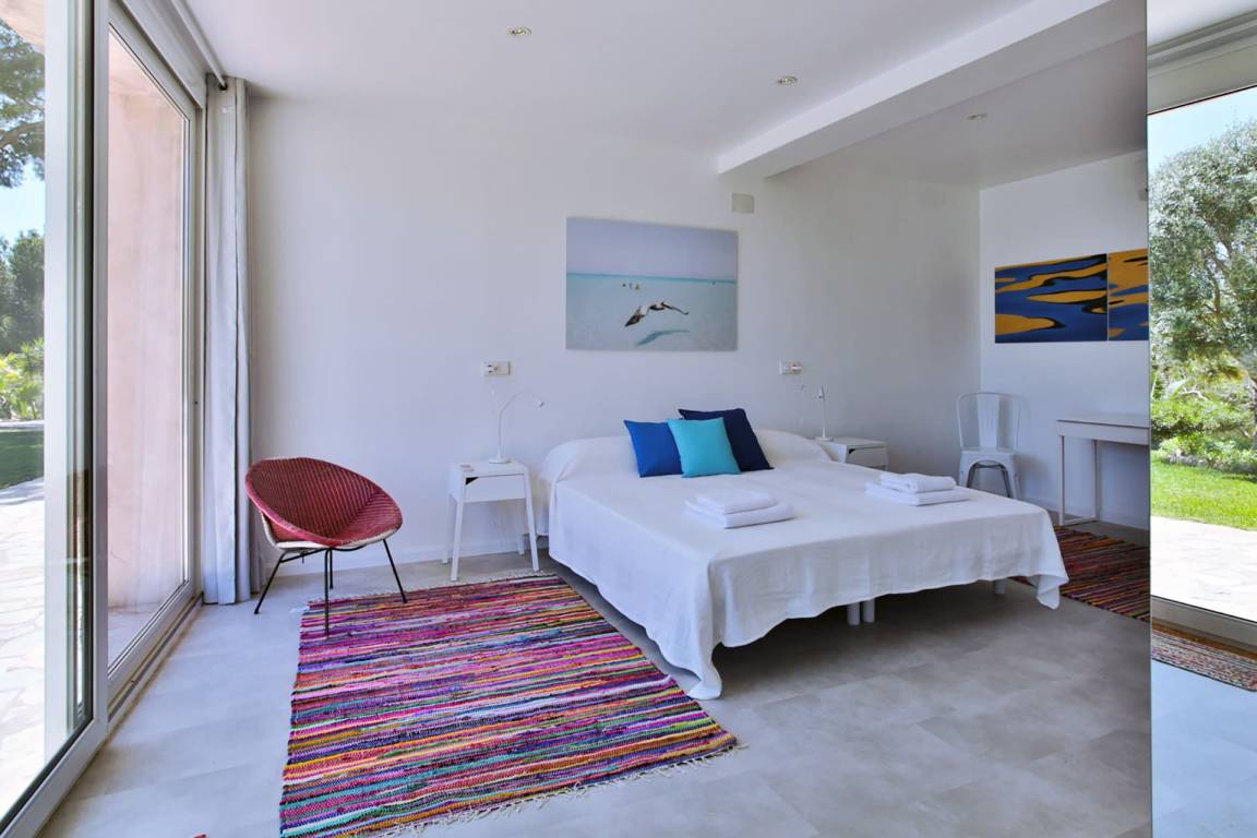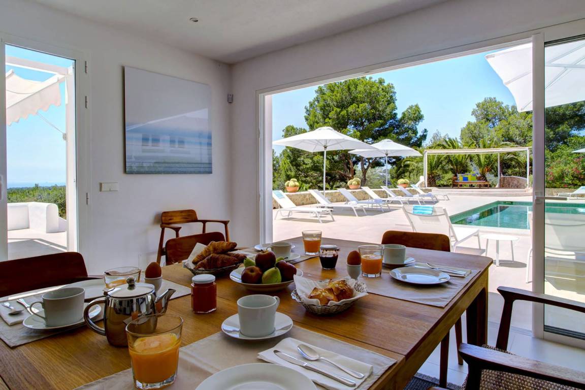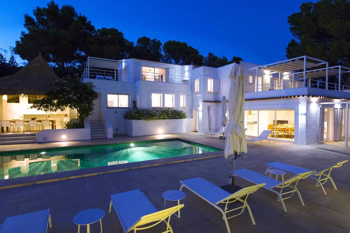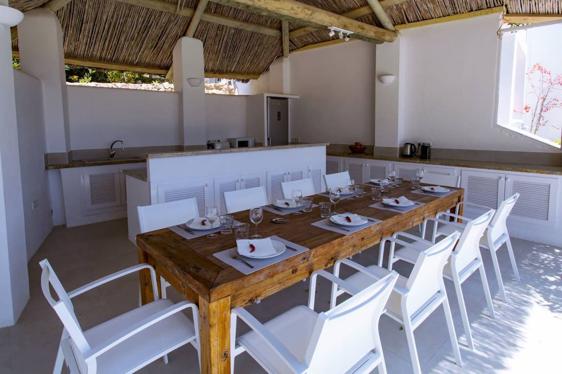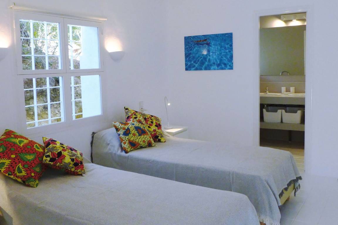 Die Villa umfasst insgesamt mehrere Geschosse, bietet Platz für bis zu 16 Gäste und verfügt über 8 Schlafzimmer und 9 Bäder. Die Schlafzimmer sind mit verschiedenen Bettkonfigurationen ausgestattet, darunter Doppelbetten und Einzelbettanordnungen. Die Bäder sind über die gesamte Immobilie verteilt und ermöglichen bequemen Zugang von allen Schlafbereichen. Die Wohnräume sind großzügig gestaltet und gehen fließend ineinander über. Von der Immobilie sind Meerblicke sichtbar. Der Außenbereich verfügt über einen privaten Swimmingpool und einen separaten Essbereich im Freien mit ausgestatteter Küche.