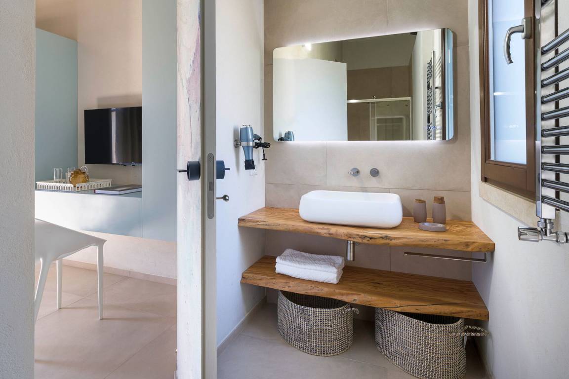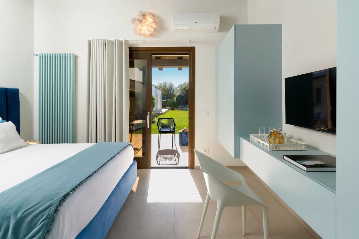 Schlafzimmer mit Bad 1: Doppelbett, WiFi Internet, Internet, Klimaanlage, Fliegengitter, Waschbecken, WC, Bidet, Dusche, Ausgang auf den Garten.