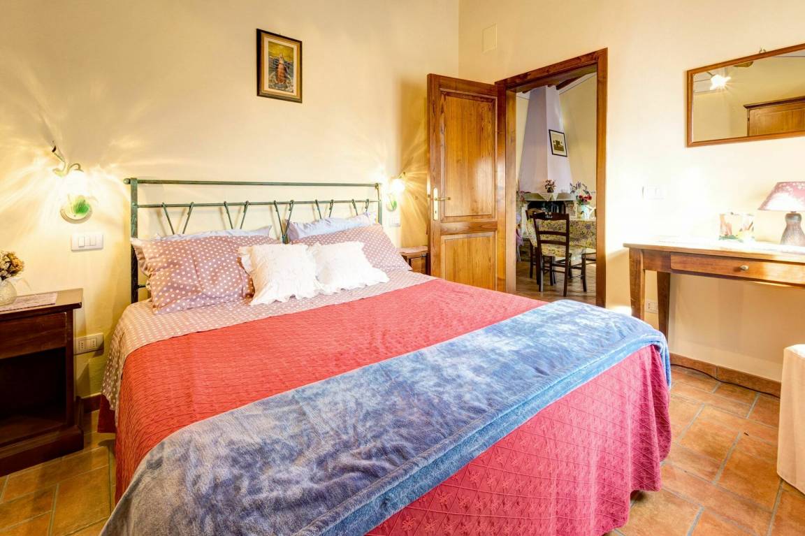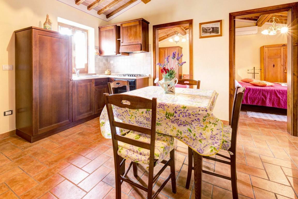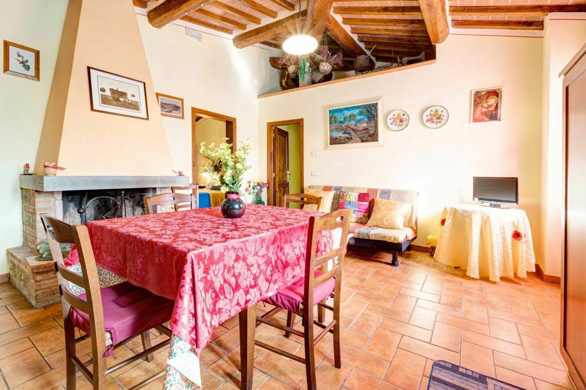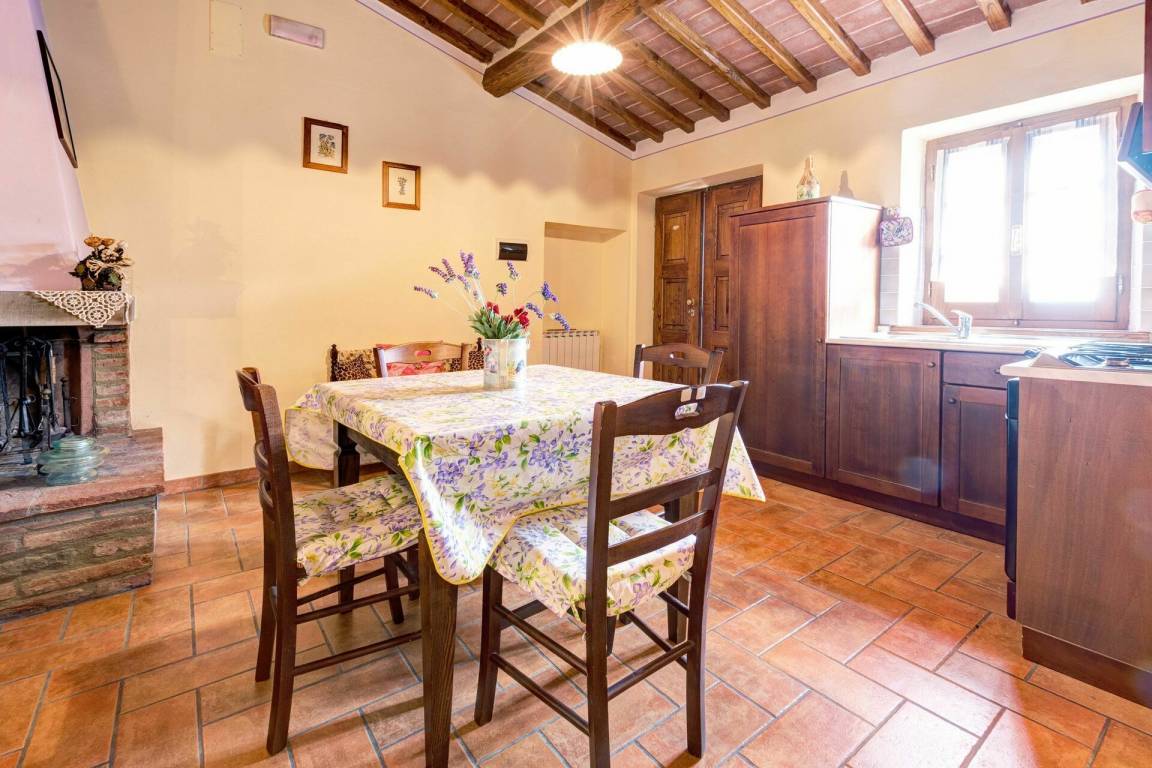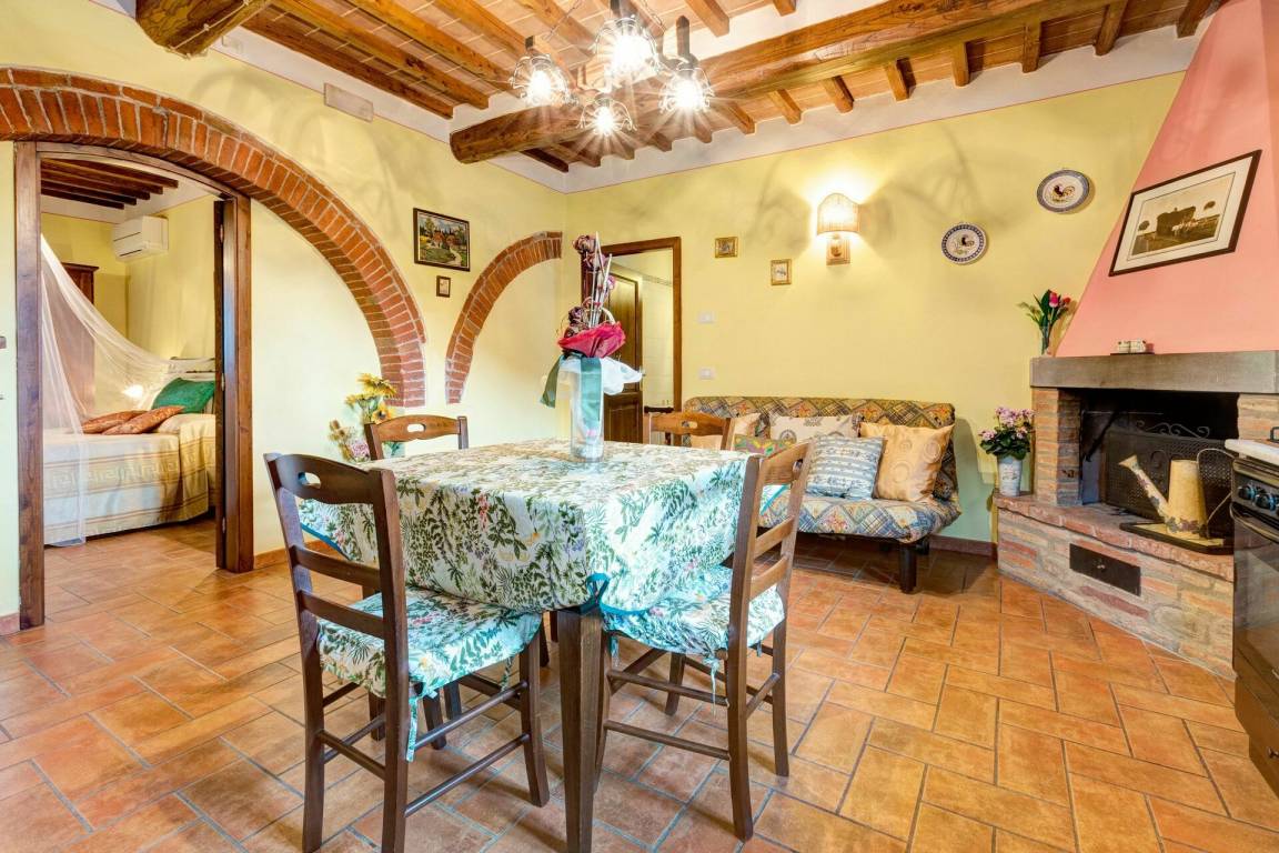 Wohnküche: Esstisch (Personen: 4), Kühlschrank, Tiefkühler, Herd, Ofen, Toaster, Italienische Kaffeemaschine, Amerikanische Kaffeemaschine, Kamin, Fliegengitter, Ausgang auf den Garten.