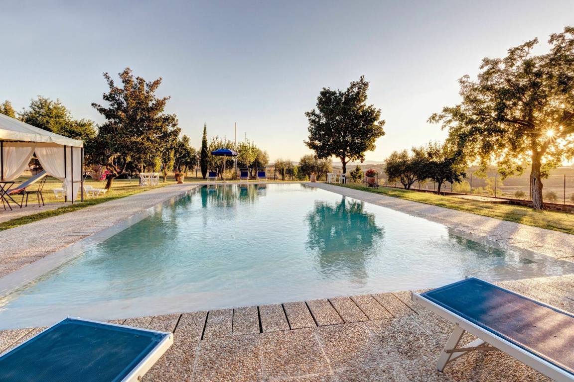 Garten: Schwimmbad (privat, Breite: 7m, Länge: 14m, max. Tiefe: 1.8m, Außen), Grill, Außenbereich für das Essen im Freien, Esstisch (Personen: 5), Pavillon, Gartenmöbel, eingezäunt, umzäuntes Grundstück, Kinderspielplatz.