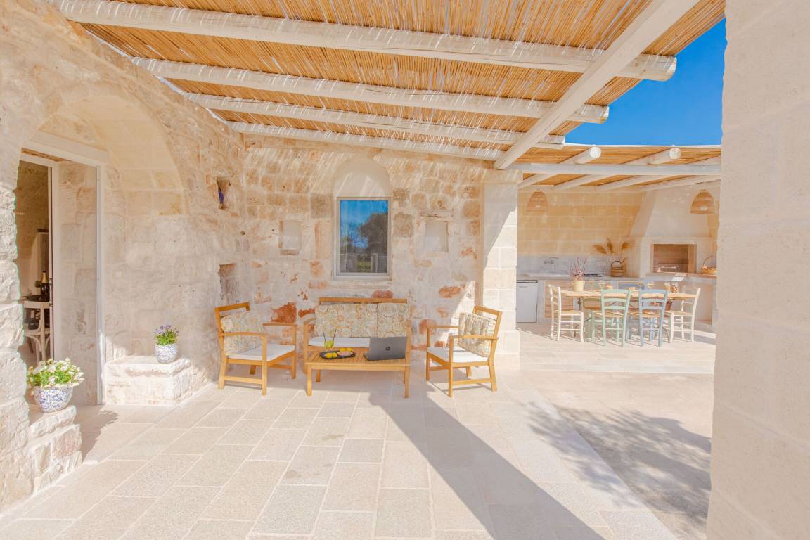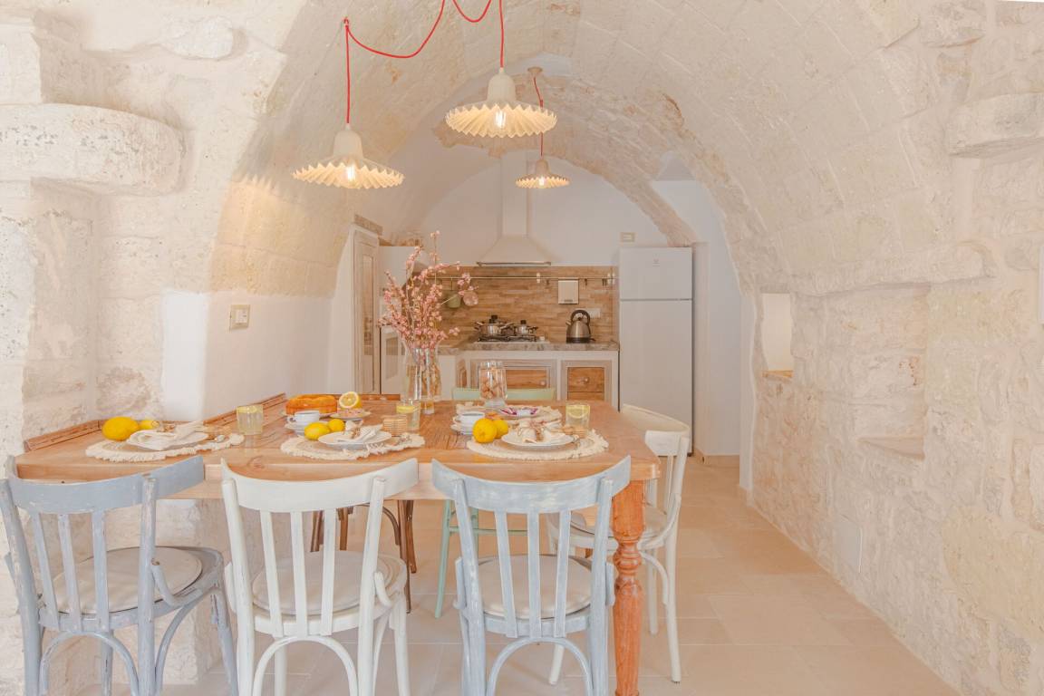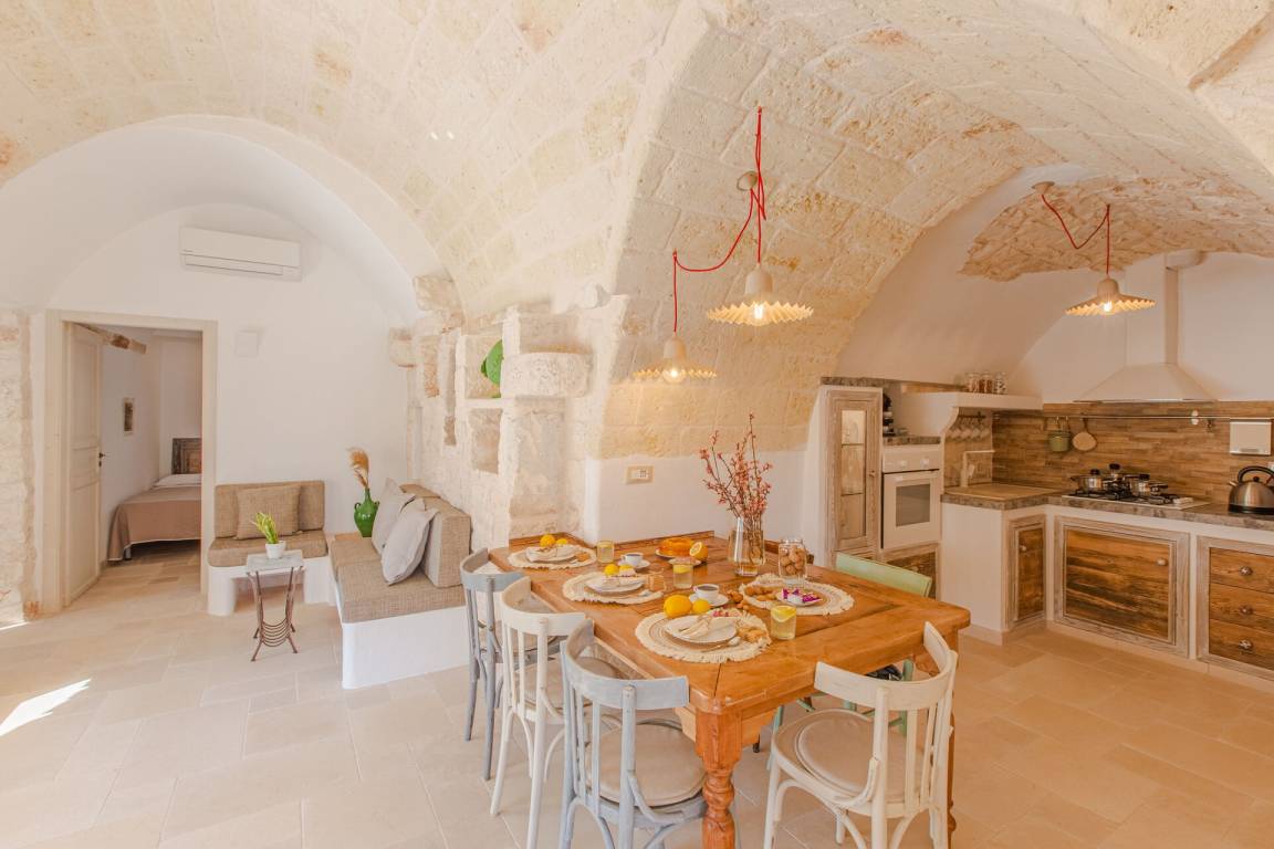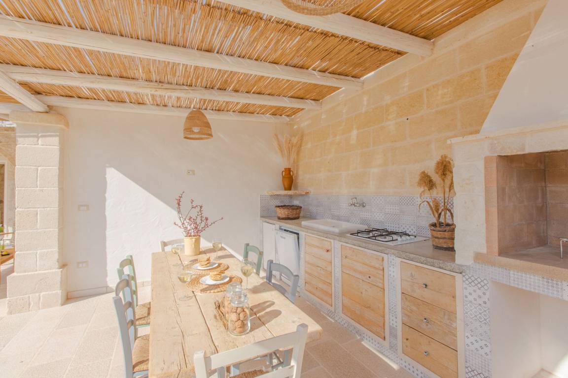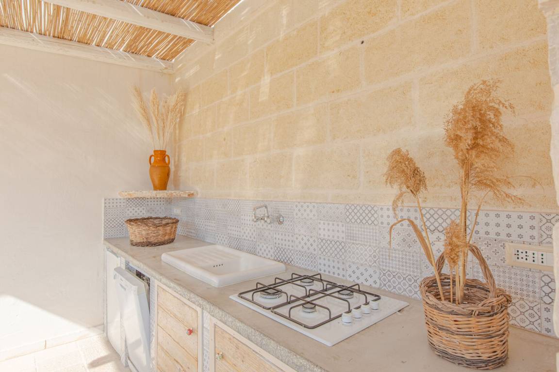 Wohnküche: gut ausgestattete Küche, Esstisch, Spülmaschine, Kühlschrank, Tiefkühler, Mikrowelle, Herd, Ofen, Italienische Kaffeemaschine, Sofa, Klimaanlage, TV, Ausgang auf den Garten, Ausgang auf die Veranda.