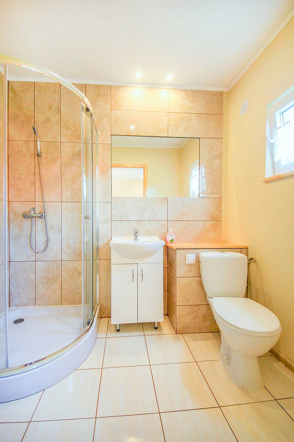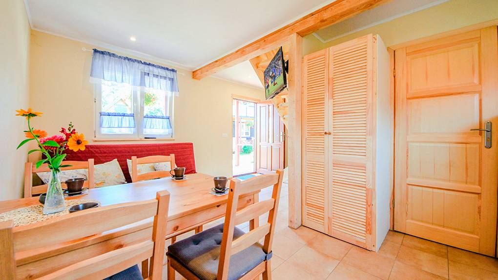 PL 65.5 Ferienhaus 2-8 Pers.: Schönes 3-Zimmerhaus mit 55 qm Wohnfläche über 2 Etagen. Parterre: Wohn-/Essraum mit Sofa (Ausziehcouch 2 Pers.), Sat-TV (ARD, ZDF, RTL, KIKA), kostenloses Internet (WLAN), Esstisch, Küchenzeile (2 E-Platten Ceranfeld). Bad/WC. Dachgeschoss: zwei 3-Bettzimmer mit Doppelbett, Einzelbett. Überdachte Terrasse mit Sitzmöbeln.