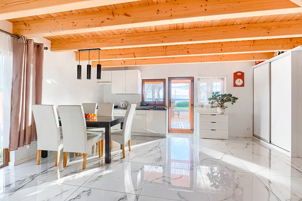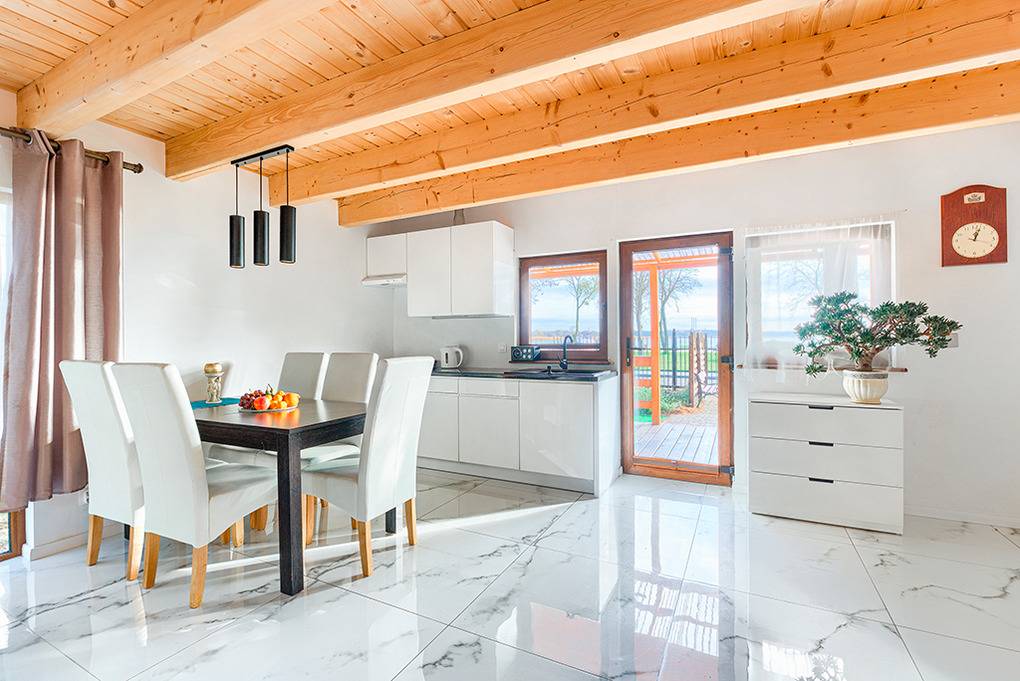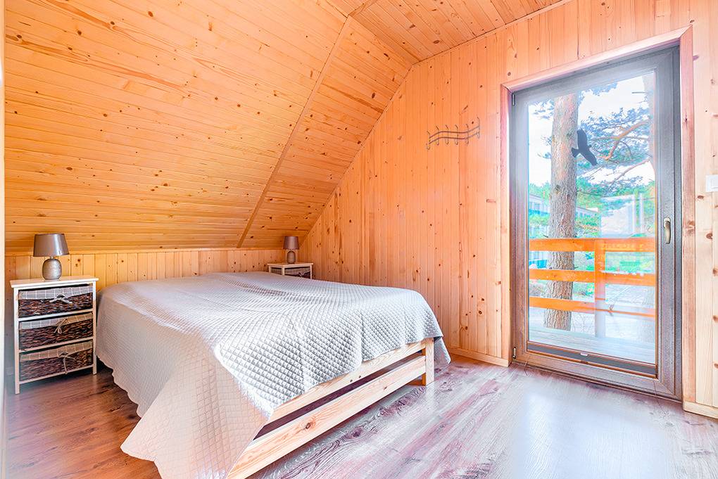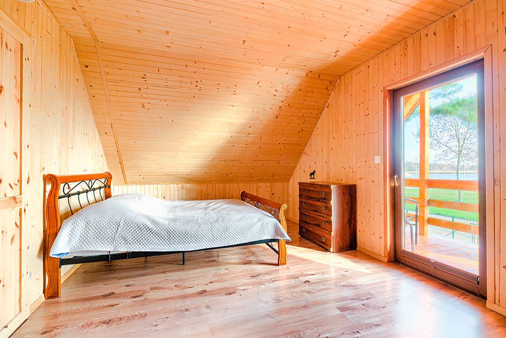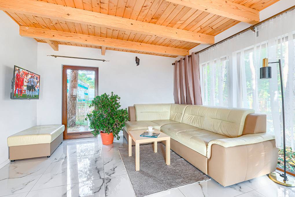 PL 65.7 Ferienhaus 2-6 Pers.: Geschmackvoll möbliertes 3-Zimmerhaus mit 80 qm Wohnfläche über 2 Etagen. Parterre: Schöner Wohn-/Essraum mit bodentiefen Fenstern, rustikaler Holzbalkendecke, Kamin, Sofa (Ausziehcouch 2 Pers.), Flachbild Sat-TV mit dt. Programmen, kostenlosem Internet über WLAN, Esstisch, Küchenzeile (2 E-Platten Induktionsfeld, Mikrowelle, Tiefkühlfach 50 l.). Bad: Du, Wb, WC, Waschmaschine. Holztreppe ins Dachgeschoss: Zwei 3-Bettzimmer mit Balkon, einer mit Sitzmöbeln und herrlichem Blick auf den Bukowosee.
