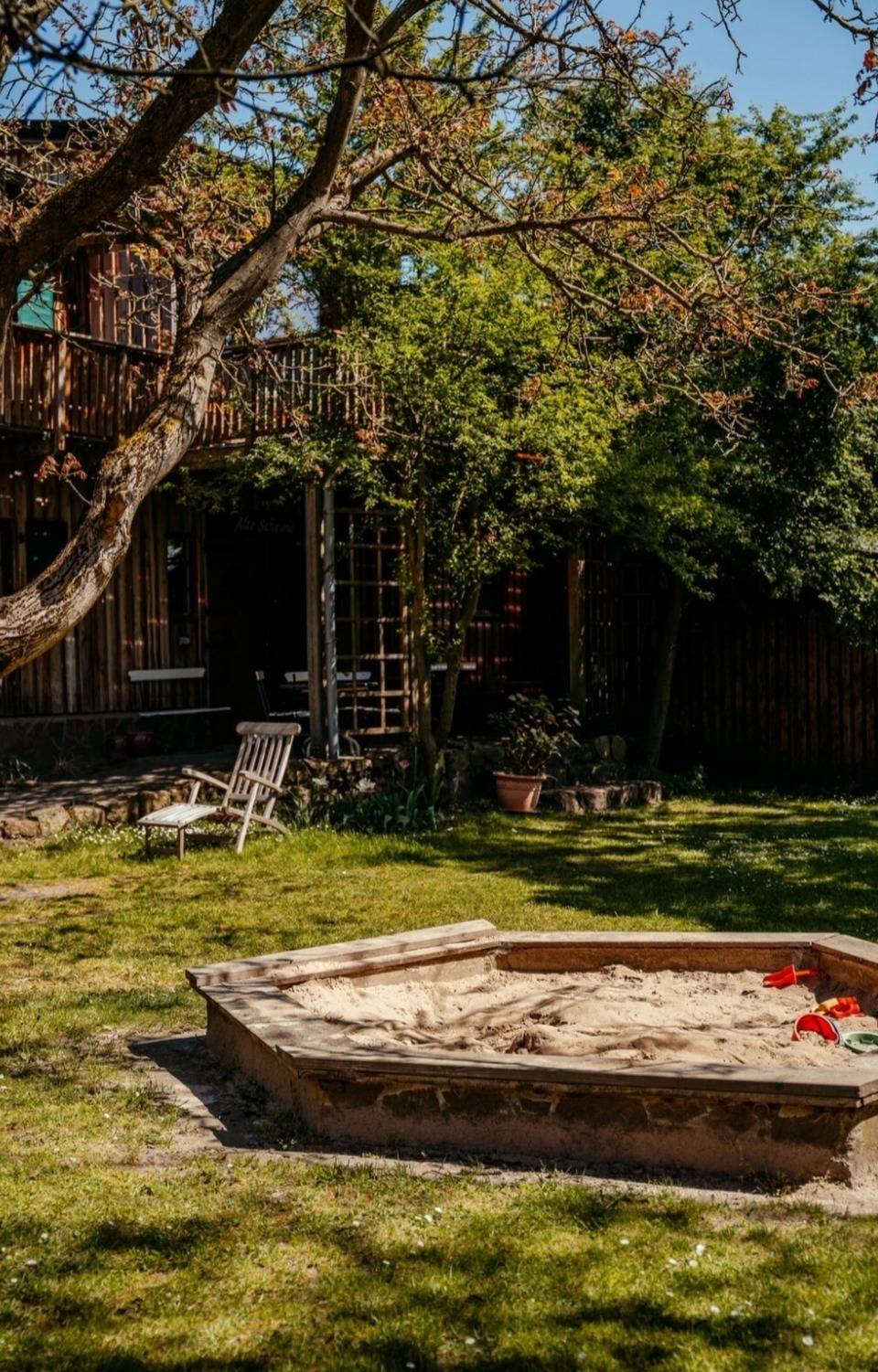 Es sind diverse Bereiche im Garten mit Liegen zum Erholen für die Erwachsenen und verschiedene Spielmöglichkeiten, wie Sandkasten, Schaukel, Kletterbaum und Bolzplatz für die Kinder vorhanden.