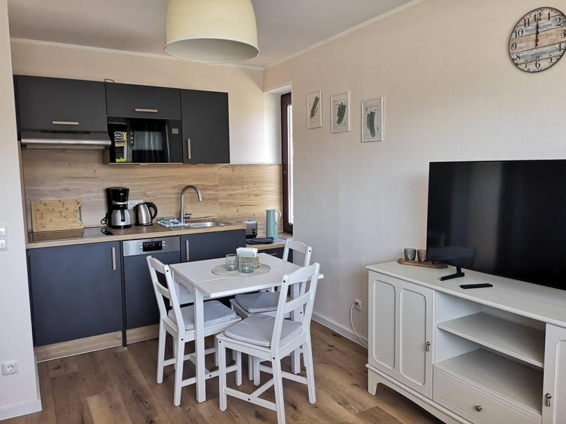 Die Wohnung 2 im Haus Ostseeliebe bietet eine gemütliche und moderne Ausstattung für 2-4 Personen. Sie verfügt über ein einladendes Wohnzimmer, das mit einer integrierten Küchenzeile, einer Essecke sowie einer bequemen Sitzecke ausgestattet ist. Ein separates Kinderzimmer mit einem Bett sorgt für einen angenehmen Schlafplatz, während das Schlafzimmer mit einem Doppelbett bequem Platz bietet. Das Badezimmer ist mit einer Dusche und einem WC ausgestattet. Zur zusätzlichen Ausstattung gehören kostenfreies WLAN, ein Kinderbett und ein Hochstuhl. Die Wohnung ist Teil eines Hauses mit insgesamt 9 Ferienwohnungen und bietet den Gästen einen eigenen PKW-Stellplatz. Gemeinschaftlich nutzbar sind die Holzverandas im Garten, die mit Grill, Tisch und Bestuhlung zum Entspannen einladen. Die Lage ermöglicht einen kurzen Fußweg von etwa 400 Metern zum Strand von Dahme.