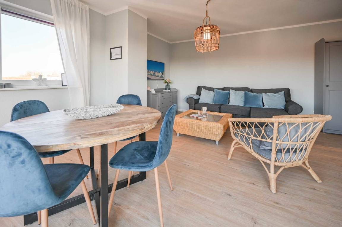 Die schöne Fewo verfügt über ein Wohnzimmer mit Ecksofa, Korbsessel, Couchtisch, 43 Zoll 4K Flachbild-TV, Esstisch mit 4 Stühlen und integrierter Küchenzeile mit Kaffeekapselmaschine. Aus dem Fenster sieht man das Meer.