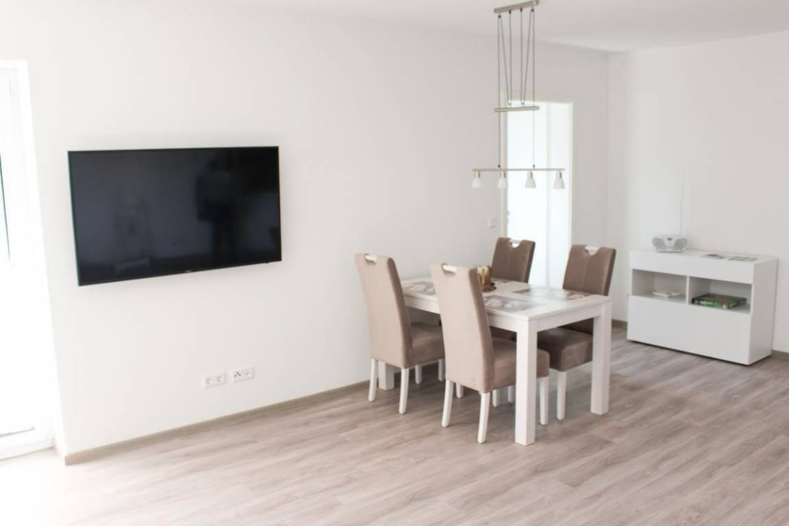 Die Ferienwohnung 2 in den Ferienappartements zur Strandwiese bietet auf 65 Quadratmetern großzügigen Wohnraum. Der Wohn- und Essbereich überzeugt mit einer modernen Küchenzeile und einer großen Sitzecke, die mit einem Smart TV ausgestattet ist. Hier befindet sich auch der Esstisch, an dem gemeinsame Mahlzeiten zubereitet werden können. Ein helles Tageslichtbad mit bodengleicher Dusche, WC und einer hochmodernen Wärmekabine sorgt für Wohlfühlatmosphäre. Eine Waschmaschine ist zur kostenlosen Nutzung vorhanden. Das Schlafzimmer grenzt an die Terrasse und verfügt über ein komfortables Doppelbett sowie einen zusätzlichen TV. Die gesamte Wohnung bietet kostenloses WLAN und ist mit einer Fußbodenheizung ausgestattet. Ein PKW-Stellplatz vor dem Haus und eine Abstellmöglichkeit für Fahrräder sind ebenfalls vorhanden. Die Nutzung der Kinderspielecke im Gartenbereich ist gemeinschaftlich.