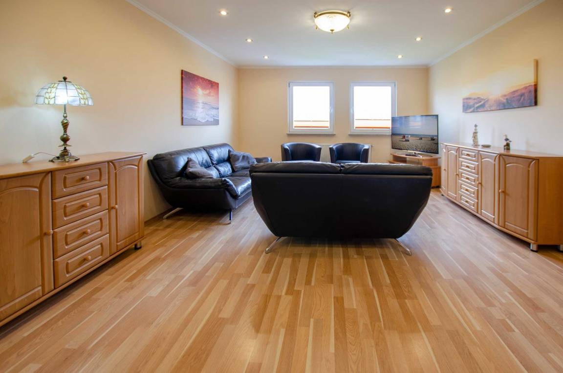 Über eine Aussentreppe kommt man in die helle, große Ferienwohnung und befindet sich direkt im Wohn- und Essbereich. Hier sind zwei gemütliche Ledersofas, Couchtisch, Kommode mit TV und ein integrierter Küchenbereich mit Tisch und 6 Stühlen sowie Zugang zur Aussentreppe mit kleiner Sitzgelegenheit (kleiner Balkon).