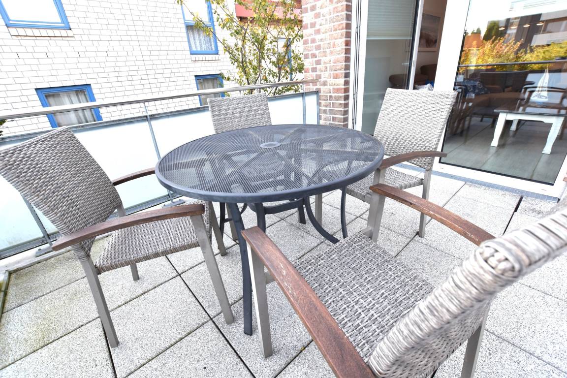 Der großzügige Wohnbereich lädt zum Entspannen ein – mit Sofa, Flachbild-TV, Essecke mit vier Stühlen sowie einer offenen, voll ausgestatteten Küche (Ceranfeld, Backofen, Kaffeemaschine, Wasserkocher, Toaster u.v.m.). Von hier gelangen Sie direkt auf den möblierten Balkon – ideal für gemütliche Stunden an der frischen Luft.