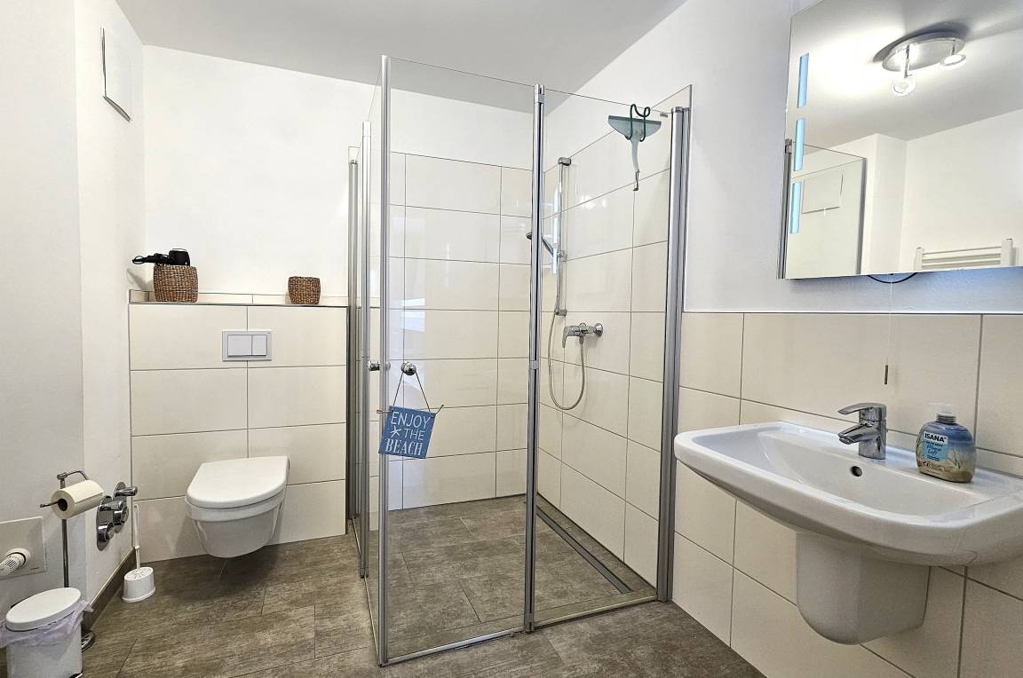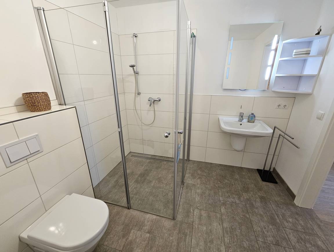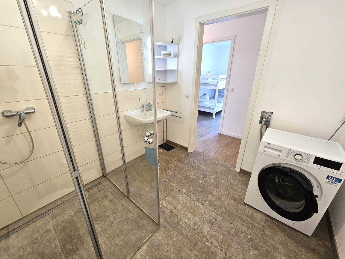 Beim Betreten erwartet Sie ein heller Flur mit Garderobe, Sitzbank und Spiegel. Links befindet sich das moderne Duschbad mit bodentiefer Dusche, Handtuchheizung, Waschbecken, Spiegel, Föhn sowie Waschmaschine und Trockner.