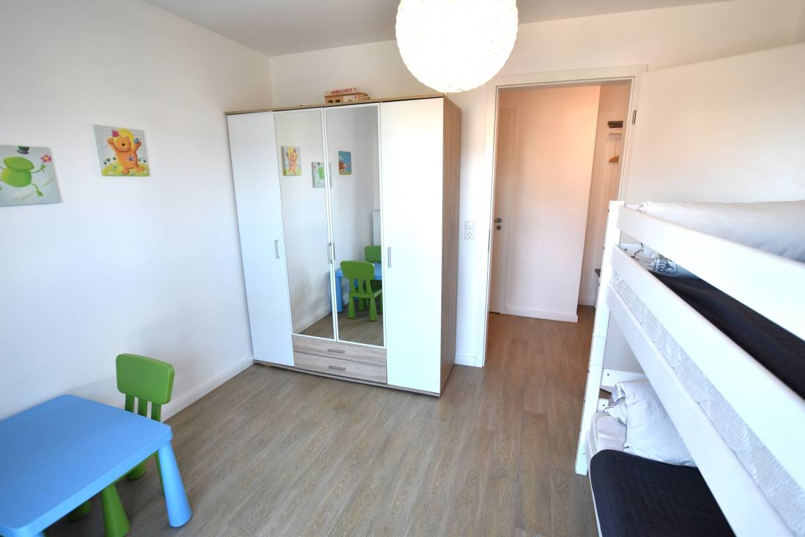 Rechts liegt das gemütliche Kinderzimmer mit Etagenbett, Spieltisch, Kleiderschrank und großem Fenster – perfekt für kleine Gäste. Ebenfalls auf der rechten Seite befindet sich das Schlafzimmer mit komfortablem Doppelbett (2x 90x200 cm Matratzen), zwei Nachttischen mit Leselampen, großem Kleiderschrank und Fenster.