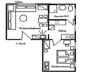 Die sonnige 2 Zi.- Wohnung Nr.2 (45qm) für 1-3 Pers. mit Internet u. Safe incl. liegt im 1. Stock und ist wie folgt aufgeteilt: