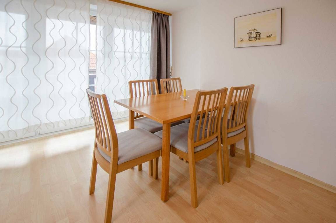 Das Wohnzimmer der Ferienwohnung ist mit einer Schlafcouch und Sessel, einem Sofatisch, einer 2-türigen Anrichte, einem Essplatz mit sechs Stühlen und einer integrieten Küchenzeile ausgestattet.