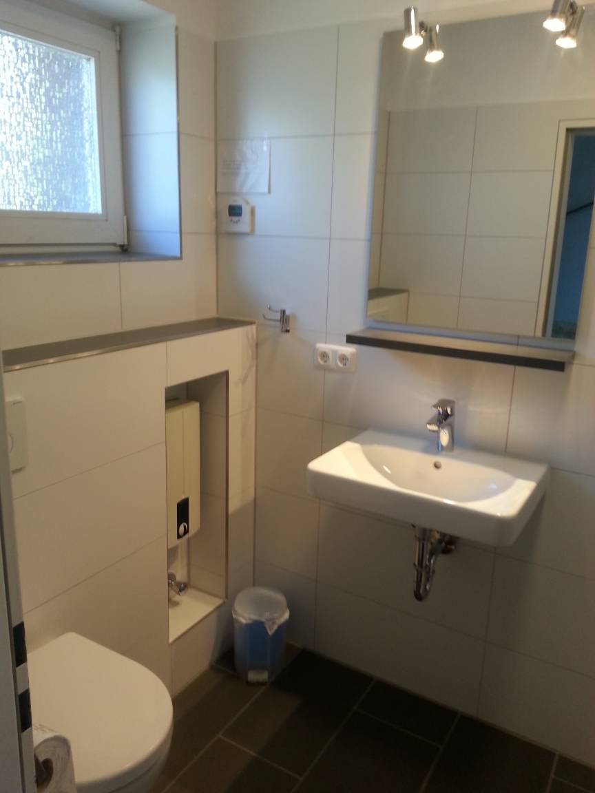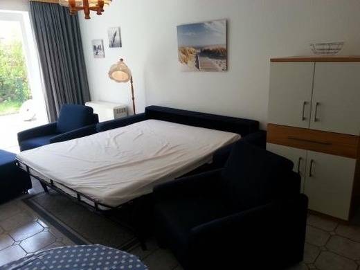 Im EG befinden sich das in 2021 renovierte Duschbad mit Fenster und das in 2020 renovierte Wohnzimmer (ca. 25m²) mit eigener, eingezäunter Terrasse (Zaunhöhe ca. 1m). Es ist eingerichtet mit 1 Sofa mit Schlaffunktion (für 2 Personen - 1,60m x 2m), 2 Sesseln, SAT-TV, Esstisch mit Stühlen und offen zur ebenfalls in 2020 renovierten Küche mit Dunstabzugshaube, Backofen, Geschirrspülmaschine, Mikrowelle, Cerankochfeld, Kühlschrank mit Gefrierfach, Kaffeemaschine, Wasserkocher, Toaster, Mixer, Eierkocher und Geschirr.