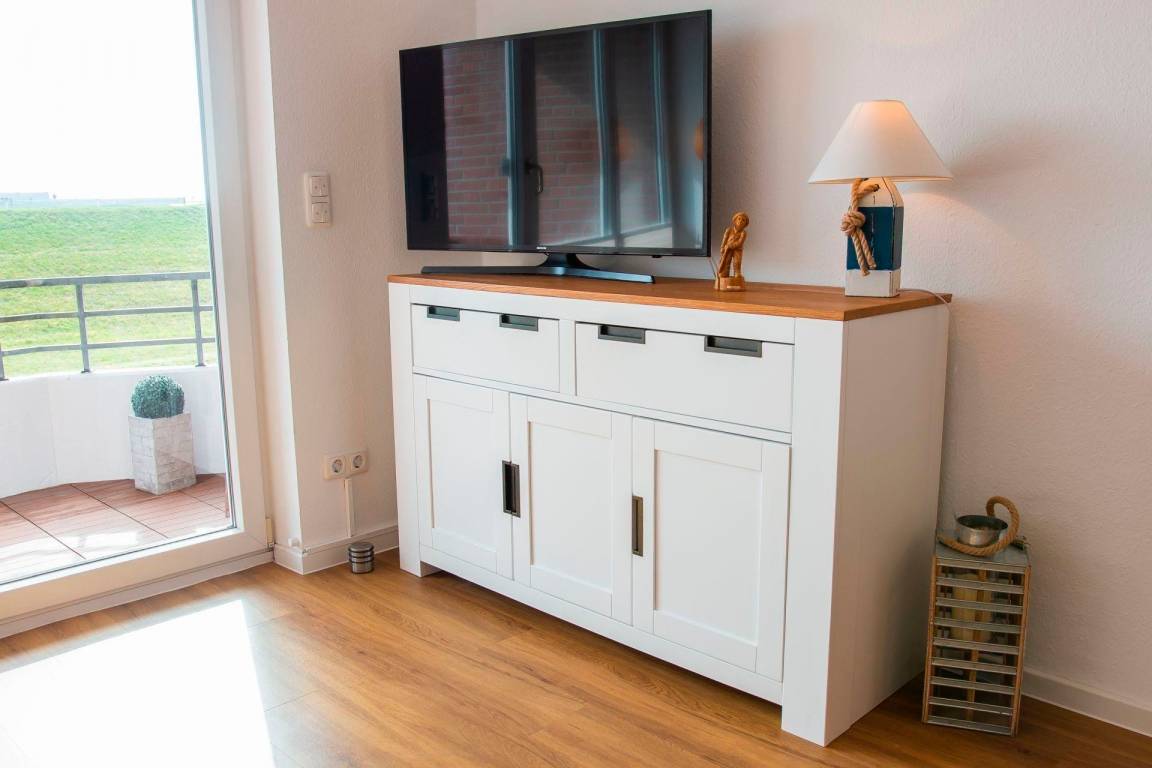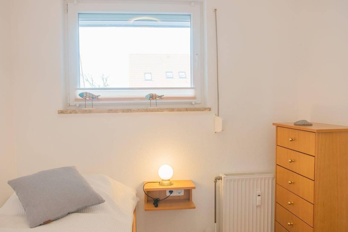 Das Zwei-Zimmer-Appartement in Dahme bietet auf 42 m² Wohnfläche Platz für bis zu 4 Personen. Es befindet sich in der ersten Etage einer gepflegten Wohnanlage und verfügt über einen Eingangsbereich mit Garderobe. Der Wohnbereich ist mit einem Ecksofa (Liegefläche max. 1,40 m) und einem TV ausgestattet, während die offene Küche mit einem Backofen punktet. Ein Essplatz für vier Personen ergänzt den Raum. Das Schlafzimmer beherbergt zwei über Eck stehende Einzelbetten (je 90x200 cm), und das Badezimmer ist mit Dusche und WC ausgestattet. Ein großer möblierter Balkon mit Blick auf den Deich lädt zum Entspannen ein. Gemeinschaftliche Einrichtungen wie Waschmaschine und Trockner sowie ein Fitnessraum mit Geräten sind im Keller vorhanden. Ein PKW-Stellplatz und eine Abstellmöglichkeit für Fahrräder sind ebenfalls verfügbar.