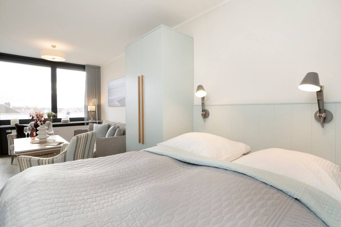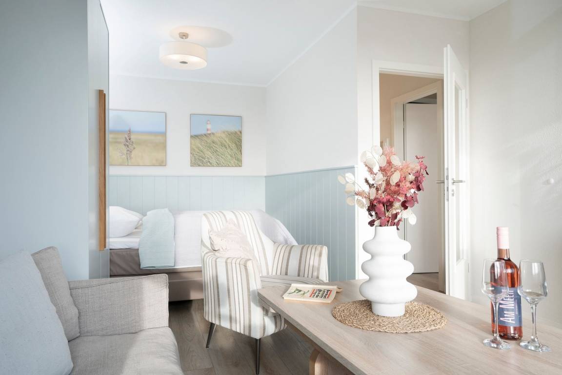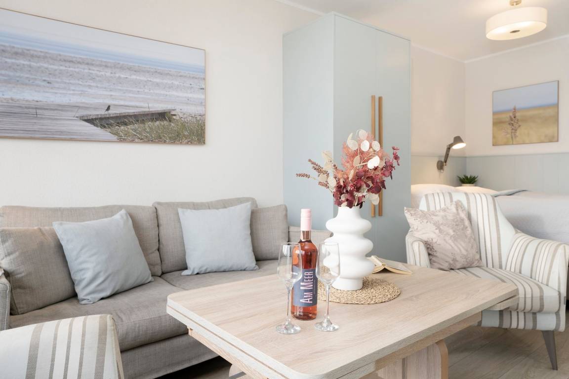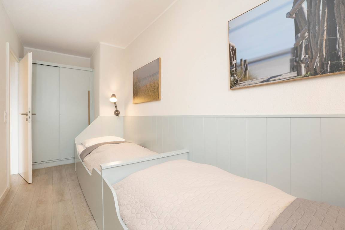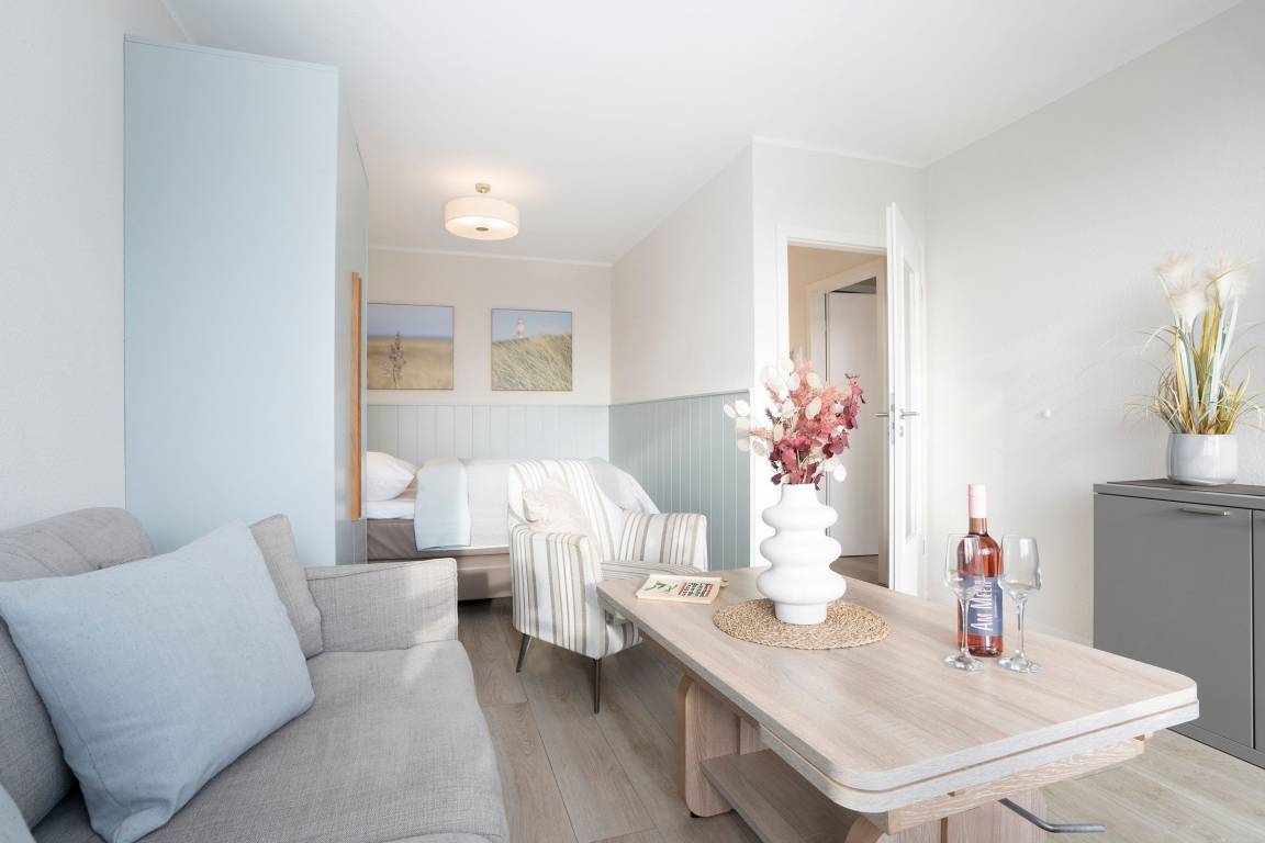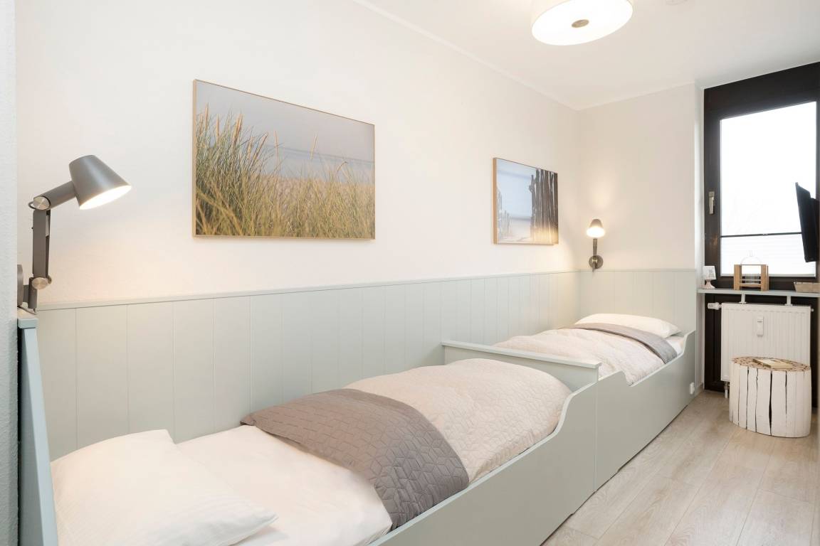 Bequem mit dem Fahrstuhl erreichen Sie diese stylisch und gemütlich modern eingerichtet Wohnung. Der lichtdurchflutete Wohn-/ Schlafraum ist optimal aufgeteilt: In einem Bereich befinden sich zum Entspannen ein bequemes Sofa, zwei Sessel und ein TV-Gerät. Hier können Sie auch den möblierten Balkon betreten und die gute Seeluft genießen. Saisonal bedingt können Sie sogar in der Ferne die Ostsee sehen. In dem hinteren Bereich des Raumes steht ein Boxspringbett (180x200 cm), das für geruhsame Nächte sorgt. Zwei weitere Schlafmöglichkeiten bietet das Kinderzimmer, das mit zwei hintereinander stehenden Betten (je 90x200 cm) ausgestattet ist. In der separaten Küche können Sie nach Herzenslust Ihre Lieblingsspeisen zubereiten. Eine Spülmaschine erledigt daraufhin den Abwasch. Das innenliegende, komfortable Badezimmer lässt Sie erfrischt und munter in den neuen Urlaubstag starten.