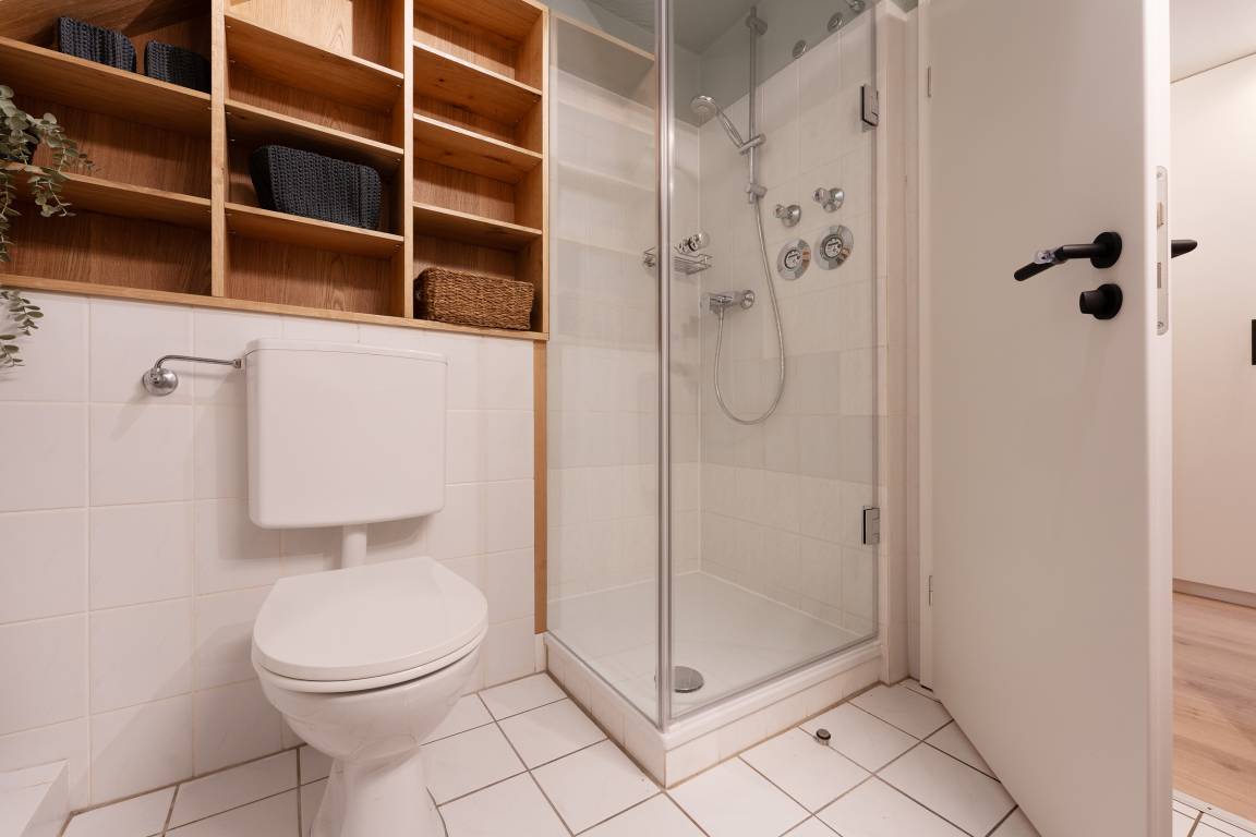 Das Badezimmer ist mit einer Dusche, WC und Waschbecken ausgestattet.