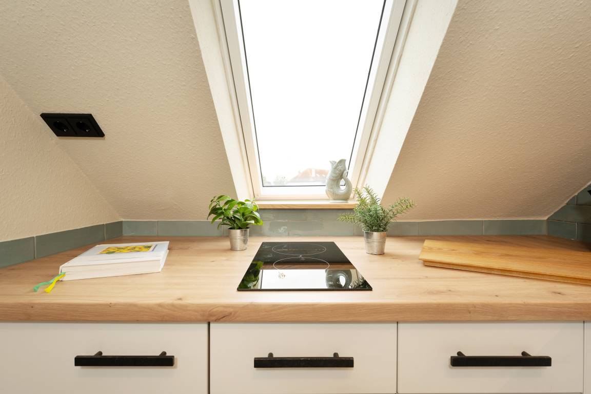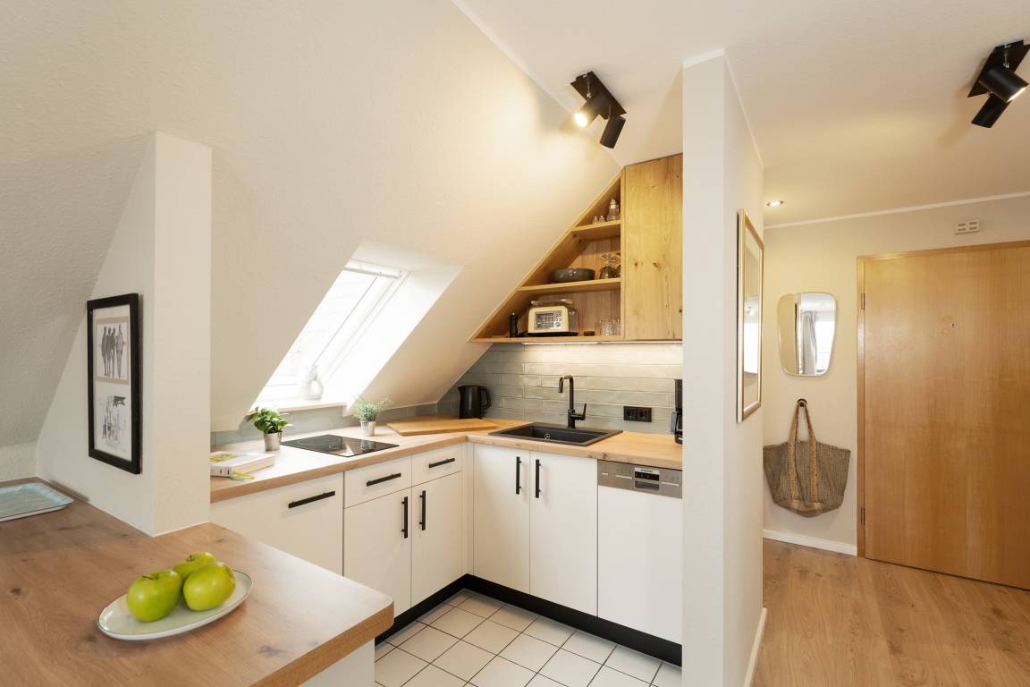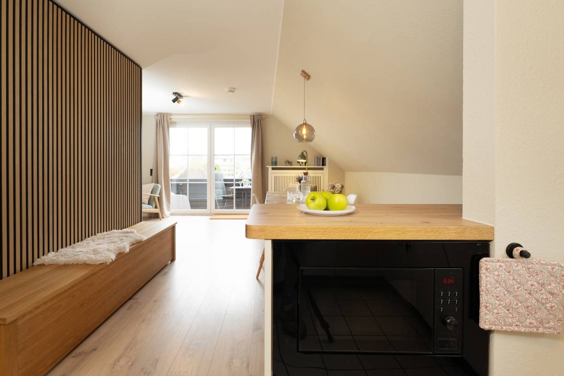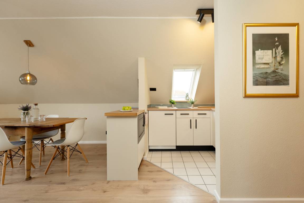 Die offene Küche ist modern ausgestattet mit Cerankochfeld, Mikrowelle, Kühlschrank mit Gefrierfach, Kaffeemaschine, Toaster und Spülmaschine. Der Essbereich bietet Platz für gesellige Mahlzeiten.
