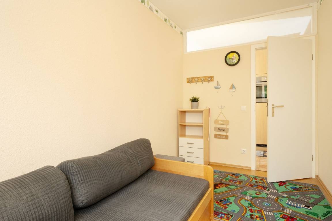 Der kombinierte Wohn- und Schlafraum wird durch einen Raumteiler optisch elegant getrennt. Ein Ecksofa mit Flachbildfernseher und ein Essplatz bilden den Mittelpunkt. Der gemütliche Schlafbereich im hinteren Bereich mit Doppelbett (2x 90x200 cm) lädt abends zum Träumen und Entspannen ein. Die kleine Küche ist durchdacht ausgestattet und Sie können hier Ihre Lieben verwöhnen. In einem separaten Kinderzimmer lässt sich das Kojenbett um einen zweiten Schlafplatz erweitern (je 90x200 cm). Abgerundet wird die Ausstattung dieser Wohnung durch das Wannenbad. Auf dem möblierten, zur Landseite gelegenen Balkon können Sie die Nachmittagssonne und die gesunde Ostseeluft genießen.