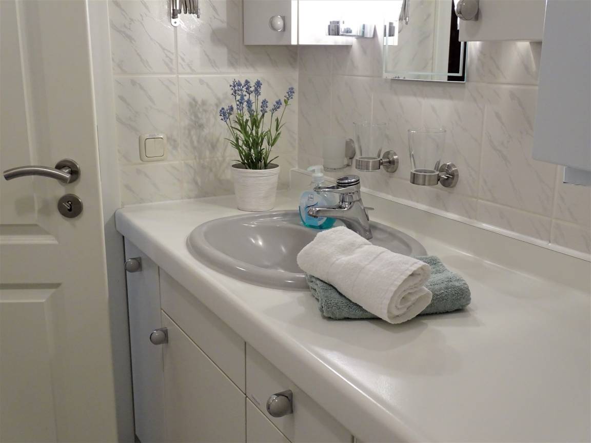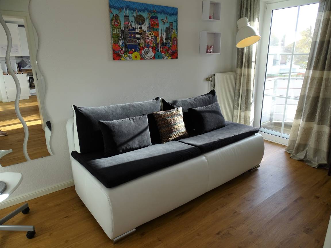 Dieses Ferienobjekt ist liebevoll und modern eingerichtet und verfügt als einziges Ferienobjekt in dieser Appartementanlage über 2 separate Schlafzimmer und 3 kleine Balkone. Sie befindet sich in der 1. Etage der schönen Appartementanlage und ist wie folgt aufgeteilt: Eingangsbereich mit Garderobenschrank, Badezimmer mit Dusche, WC, Waschmaschine, Schlafzimmer mit Doppelbett (180x200cm), Kleiderschrank und Balkon, Wohnzimmer mit offener komplett ausgestatteter Küche, Esstisch mit Bestuhlung, Couchgarnitur, Relaxsessel und Balkon, sowie dem 2. separaten Schlafzimmer mit einer praktischen und bequemen Schlafcouch (160x200cm) für 2 Personen, Kleiderschrank und Balkon. Ausrichtung der Wohnung ist in Richtung des Kurparks ( Sonnenseite ). Die Schlafzimmer verfügen über Außenjalousien. Ein eigener Kfz- Stellplatz befindet sich am Haus. Ein Gemeinschaftsfahrradkeller im Haus, sowie ein weiterer Abstellplatz für Fahrräder befindet sich am Haus. Luftlinie zum Wasser ca. 80m und Fußweg ca. 200m.