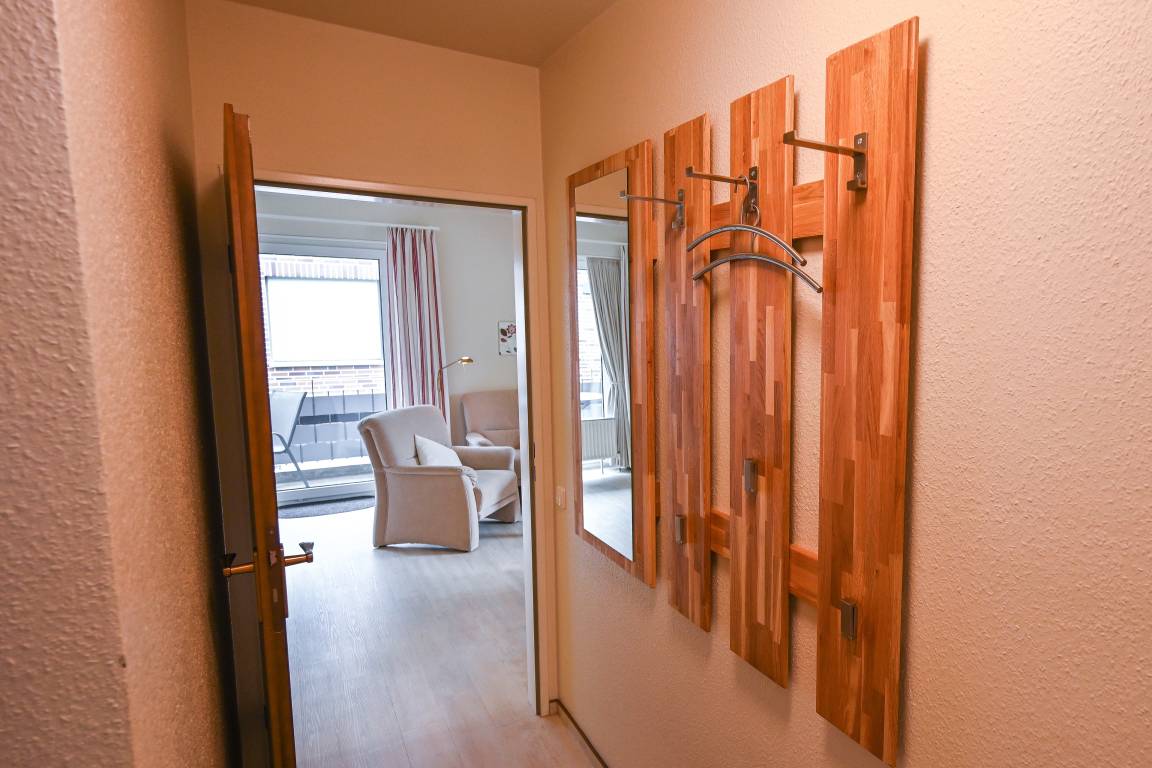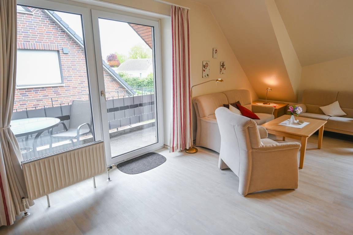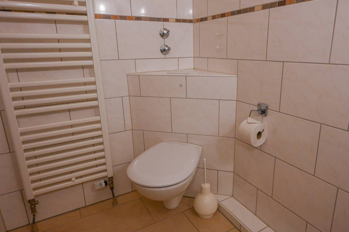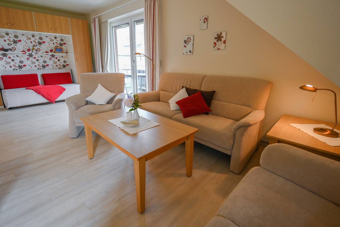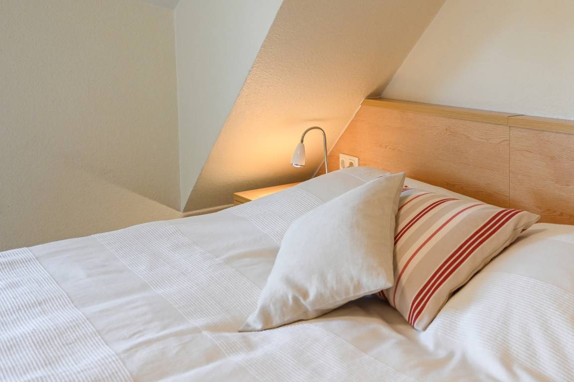 In der 1. Etage liegt unsere große 3-Raum-Ferienwohnung Nr.19 mit Südbalkon. Sie eignet sich für 2-4 Personen und ist mit einem Wohnschlafraum mit Schlafsofa, 2 Schlafräumen zum Teil mit Komfortbetten in Überlänge, Küche mit Geschirrspüler und Mikrowelle, Dusche/WC und Flur ausgestattet. Eine aufwendige Dachkonstruktion gibt der Wohnung ihren besonderen Charme.