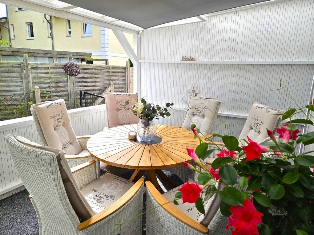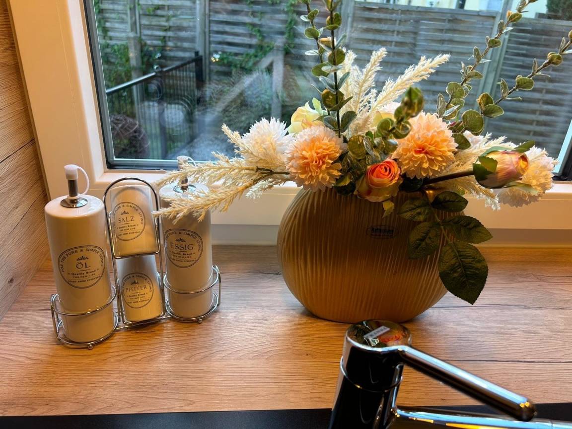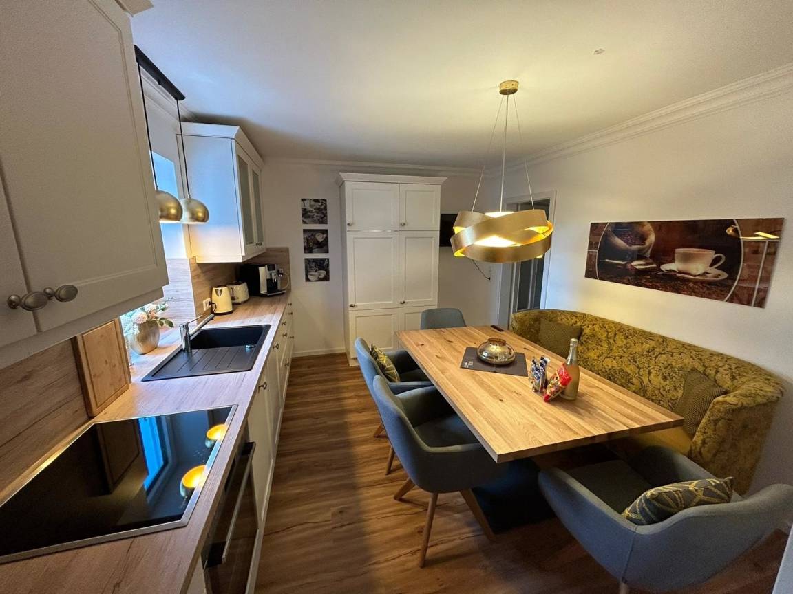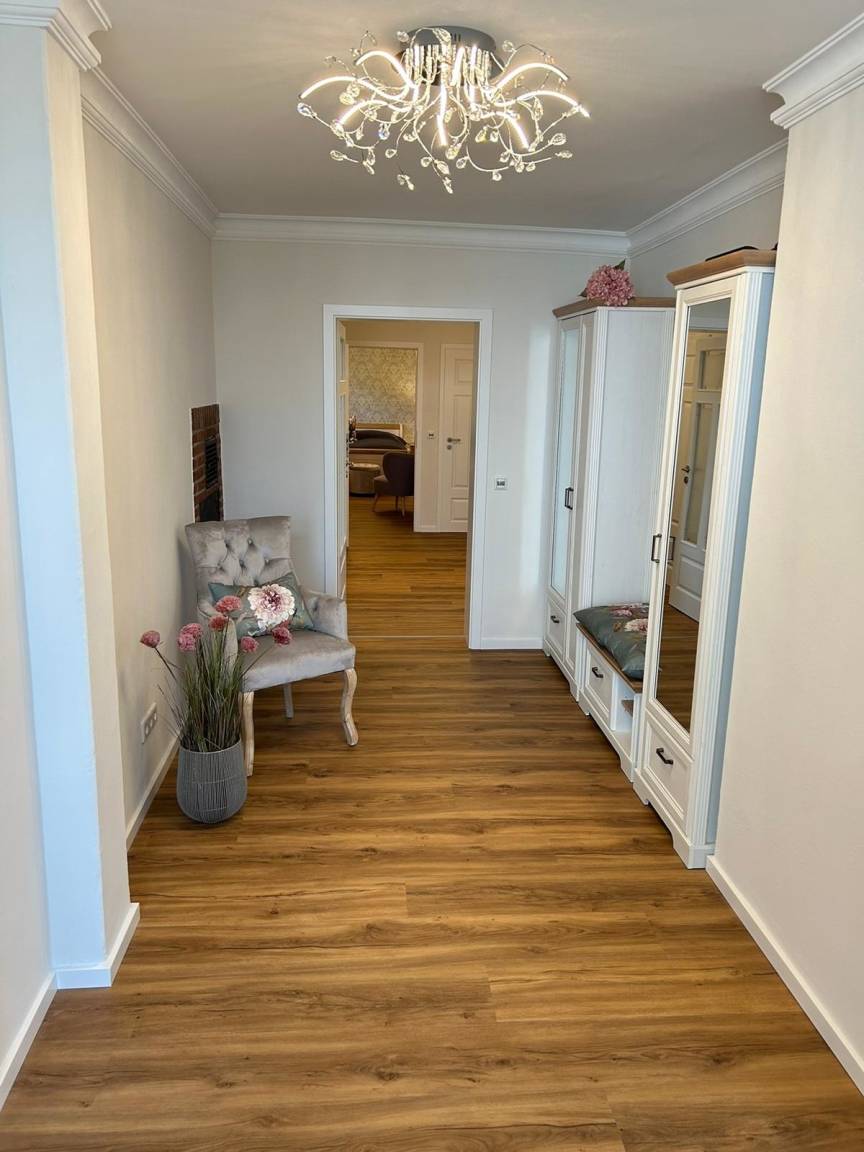 Aufgeteilt ist die 4 Zimmer Ferienwohnung in einem geräumigen Flur von dem alle Räume abgehen. Die Küche ist mit einem Herd mit Backofen, Geschirrspüler, Kühlschrank mit Gefriefach, Esstisch, Stühlen ausgestattet und Zugang zum bestuhlten Wintergarten.