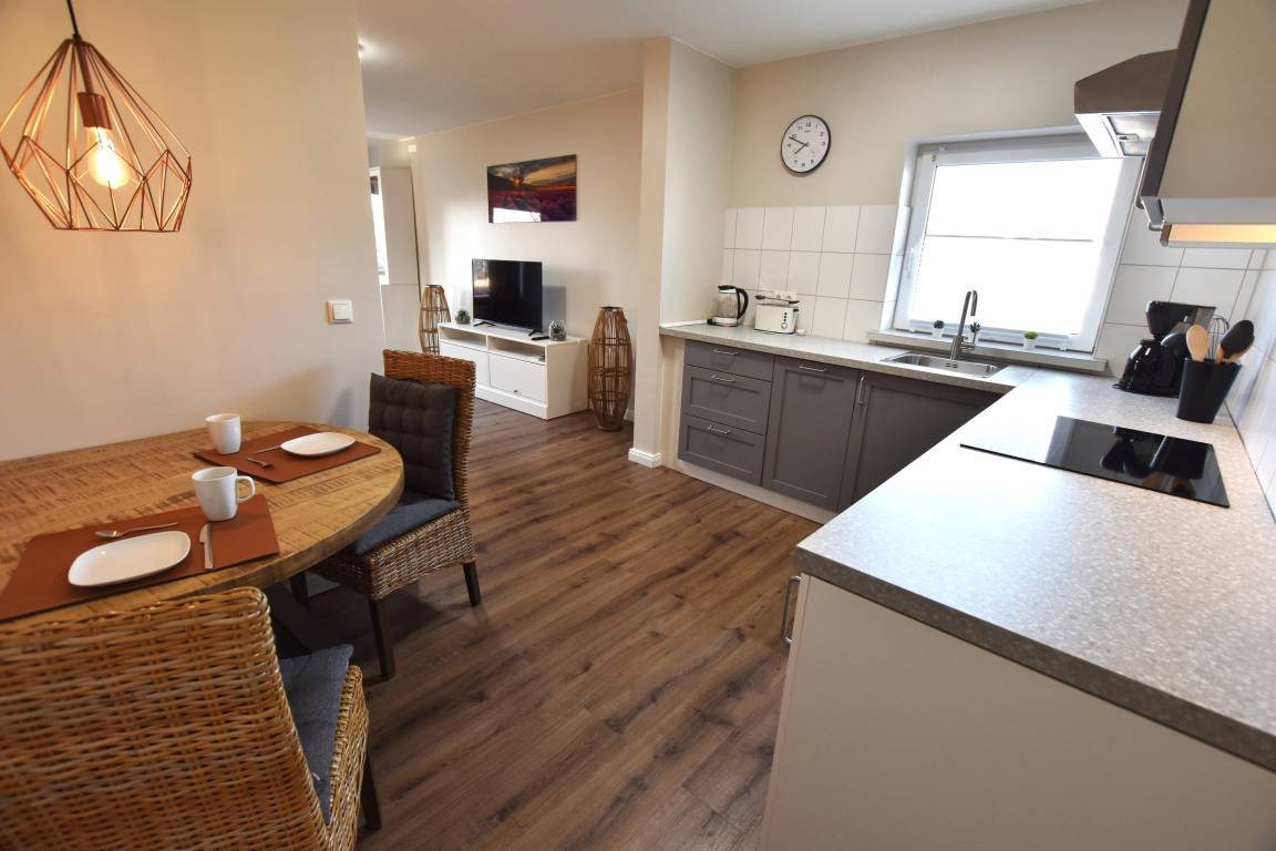 Eingangsflur mit offener Küche mit Kaffeemaschine, Toaster, Wasserkocher, Geschirrspüler offen zum Wohnzimmer hin. Hier können Sie den Abend gemütlich ausklingen lassen. Schlafzimmer mit einem Doppelbett (2 x 90 cm x 200 cm), TV, Kleiderschrank und dem Zugang zum Balkon. Duschbad mit flacher Dusche und Waschmaschine