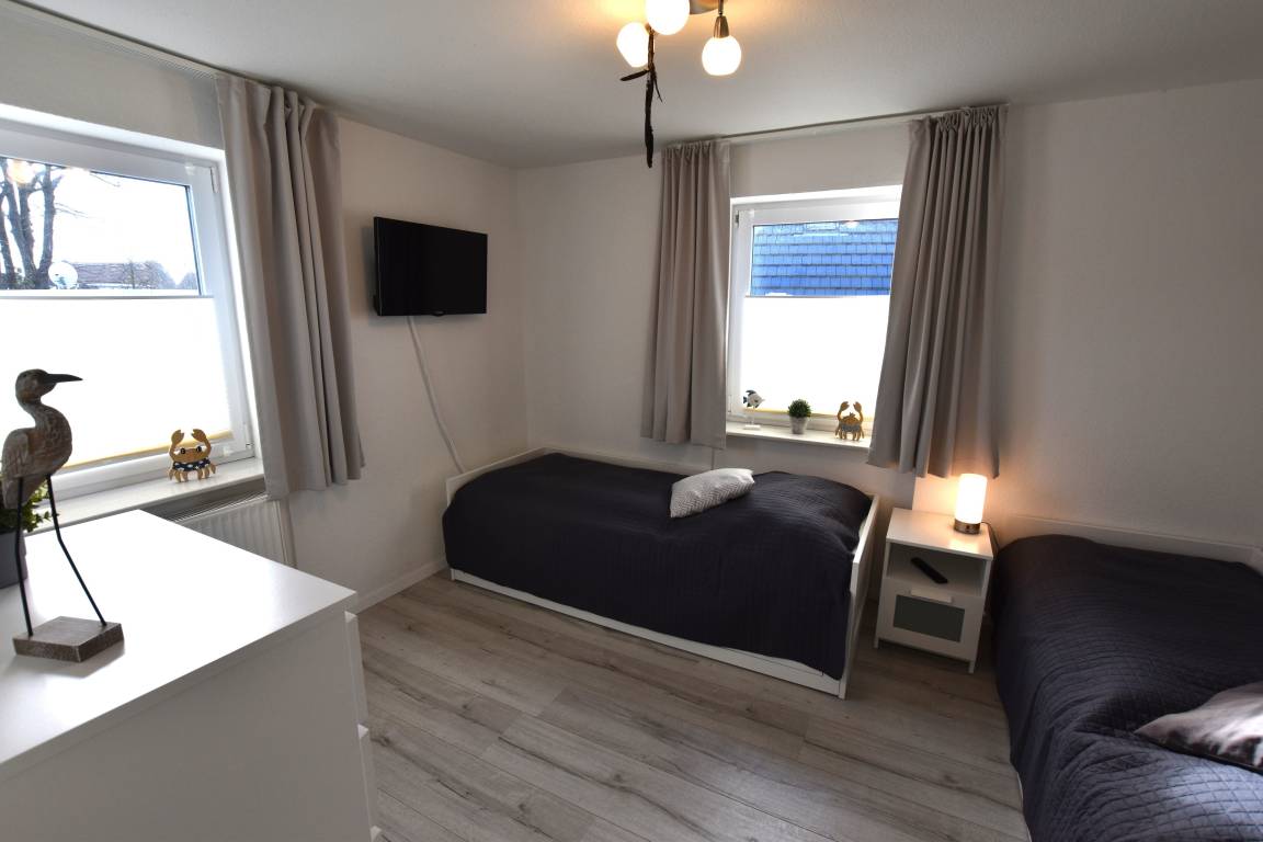 *Schlafzimmer (2) mit Tv, Plissees, zwei Einzelbetten (80x200), wovon ein Bett umgebaut werden kann auf (2x80x200), Nachtleuchte und Verdunkelungsvorhängen.