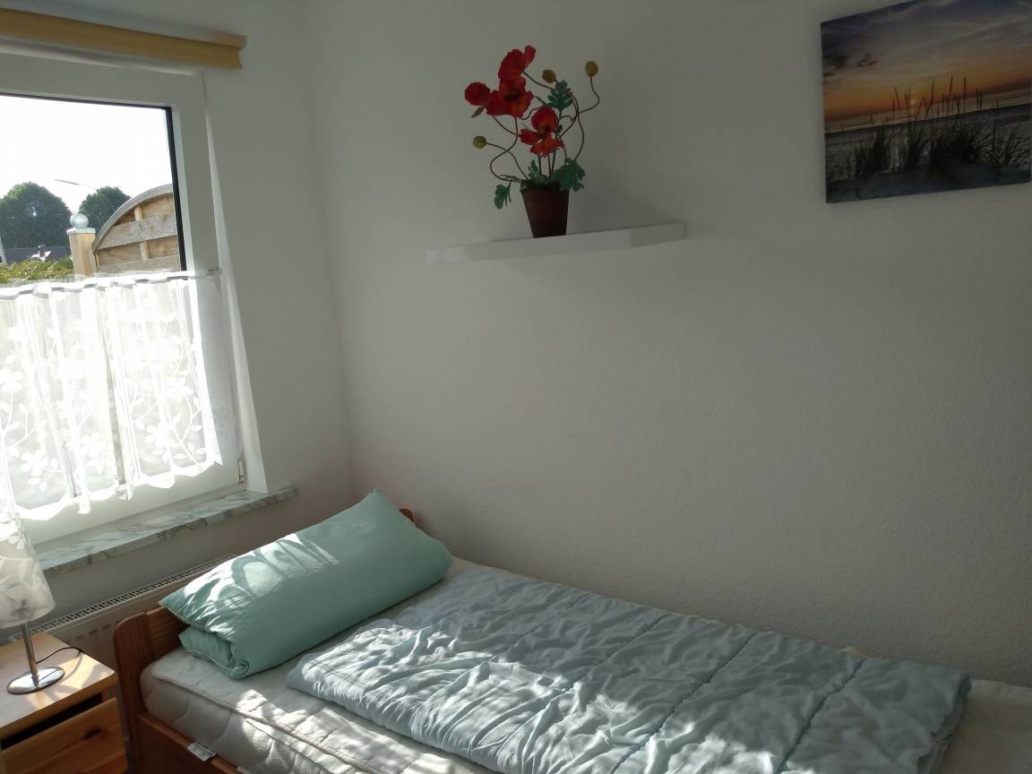 Kleines Zimmer. m. 1 Bett (90cmx200cm), Nachtschrank, Kommode. Es kann ein Rausfallschutz zur Verfügung gestellt werden. Dusche/ WC m. Fön. Bodenbelag: Fliesen u. PVC. Waschmaschine u. Trockner im Haus. Süd- West- Terrasse mit Gartentisch u. Stühle mit Auflagen.