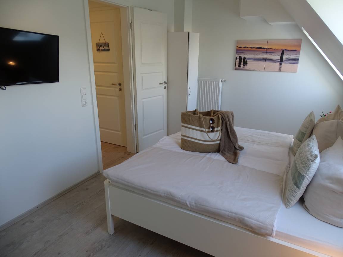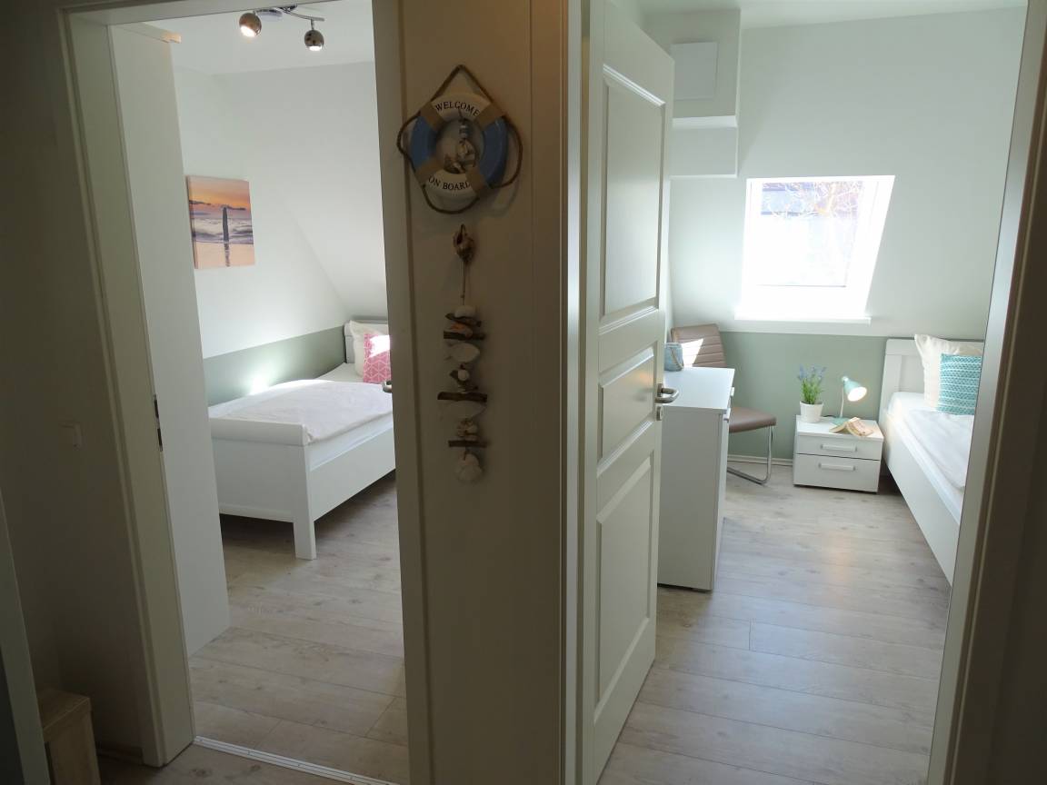 1 Schlafzimmer mit Doppelbett 180x200 und Fernseher sowie jeweils 1 Schlafzimmer mit einem Einzelbett 90x200. Ein Badezimmer mit Sauna und Dusche und ein Gäste- WC stehen in diesem Ferienobjekt zur Verfügung.